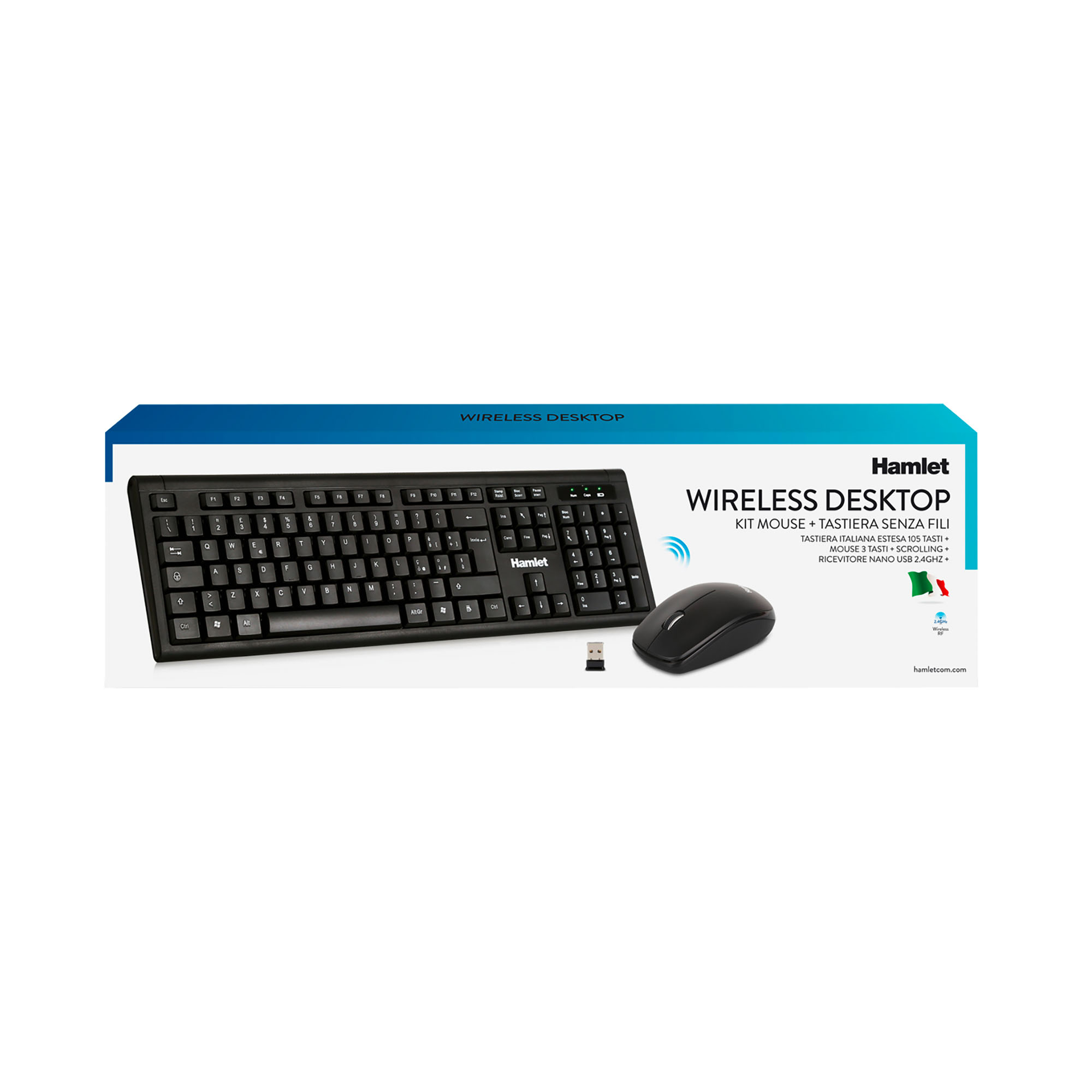 Hamlet Wireless Desktop è la soluzione più semplice per liberarsi dei cavi e fare spazio sulla scrivania. La tastiera e il mouse utilizzano la tecnologia wireless RF a 2.4 GHz per collegarsi al computer tramite un nano ricevitore (incluso) che occupa solo una porta USB del PC. La tastiera di dimensioni standard offre la massima comodità di utilizzo durante la digitazione e il mouse ottico fornisce un comodo sostegno per la mano per la massima precisione di puntamento. Hamlet Wireless Desktop ha un raggio d'azione di 10 metri e le batterie incluse offrono un prolungato utilizzo del dispositivo.