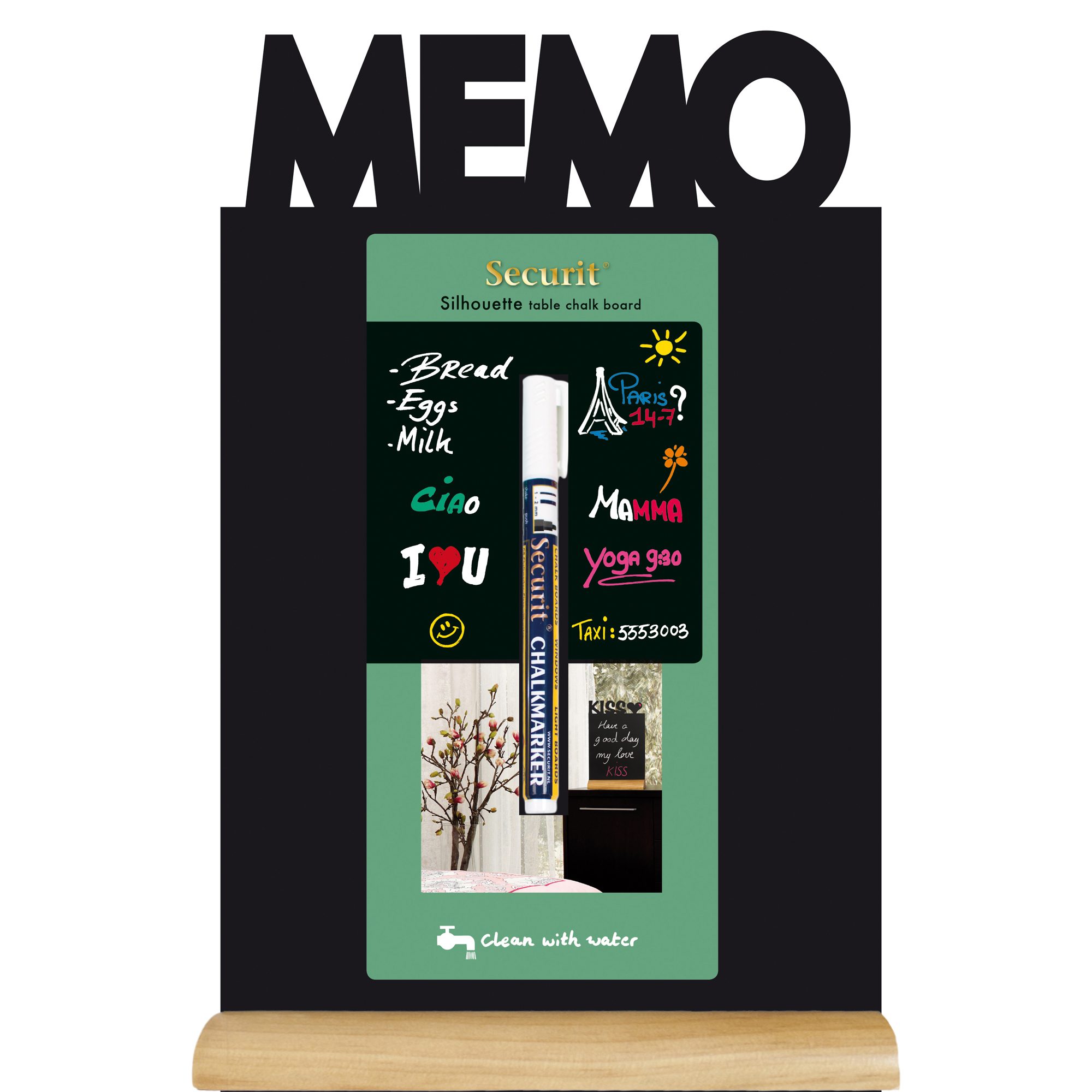Detailled descriptionFormate da una base in legno duro laccato che sorregge una lastra removibile e scrivibile da entrambi i lati. fornire con un marcatore a gesso liquido bianco.