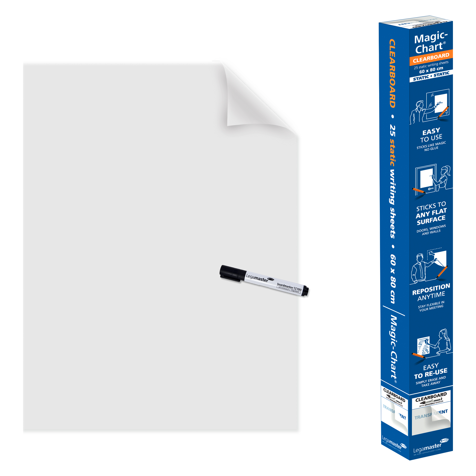 Legamaster Magic-Chart Clearboard è un foglio elettrostatico trasparente che ti consente di presentare le tue idee in qualsiasi situazione lasciando in trasparenza quanto sotto.