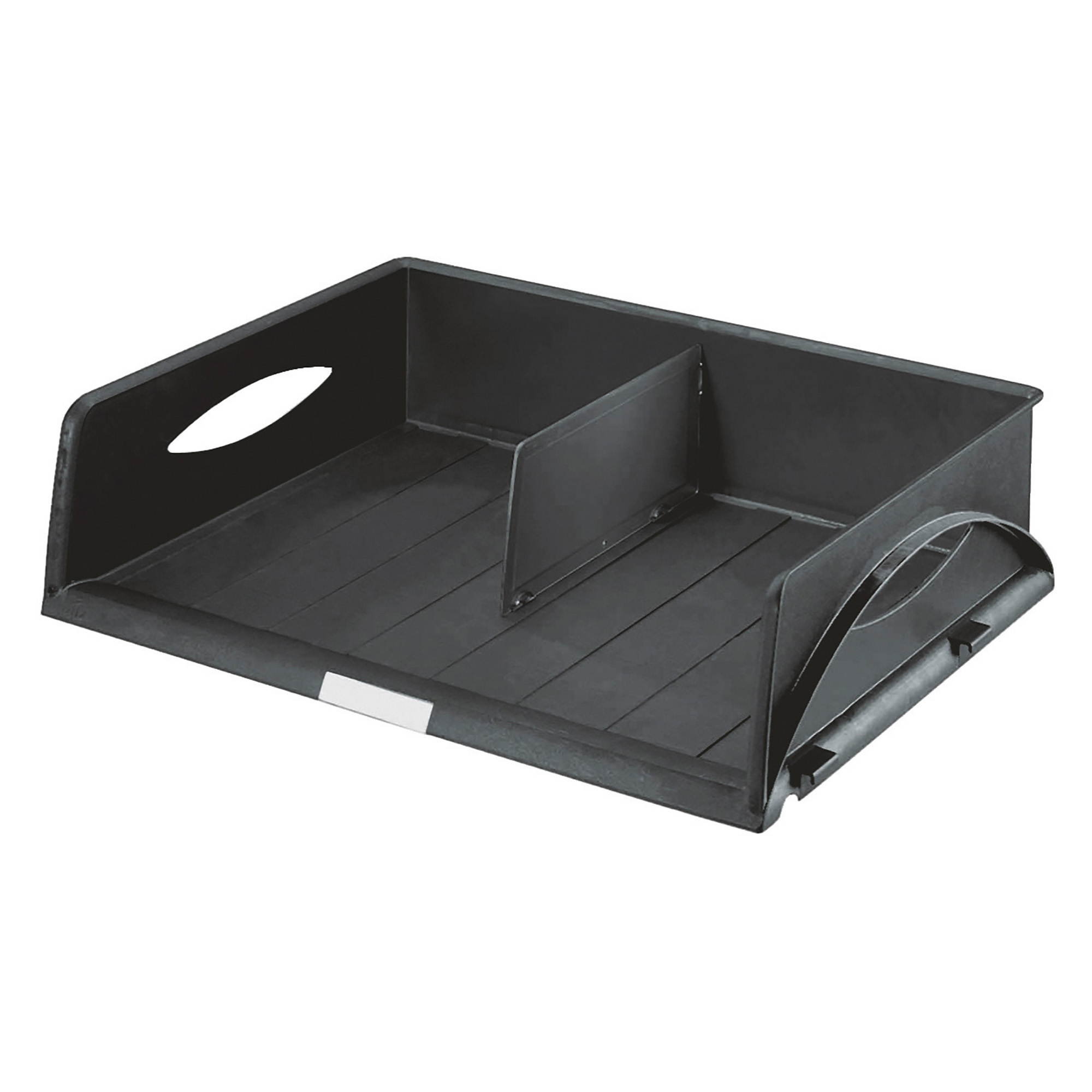 Leitz front load single letter tray Sorty Jumbo 5232. Made of polystyrene. Stackable and with a label. Includes a divider to make a subdivision. For large format documents, A3 landscape or 2 x A4. Dimensions (W x D x H): 50.8 x 38 x 12.7 cm. Colour: black.