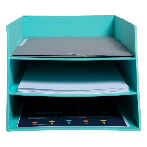 Teksto Letter tray with 3 levels Letter tray with 3 levels in cardboard -Letter tray with 3 levels for documents in A4+formats (up to 24x32cm for example elastic folder) The 3 trays can hold up to 500 sheets per tray and the slanted shape makes it easier to access the documents Made from recycled cardboard, covered with the revolutionary Teksto card and coated with vegetable oil, providing excellent water protection The products in the Teksto range are guaranteed to be resistant, durable and easy to recycle