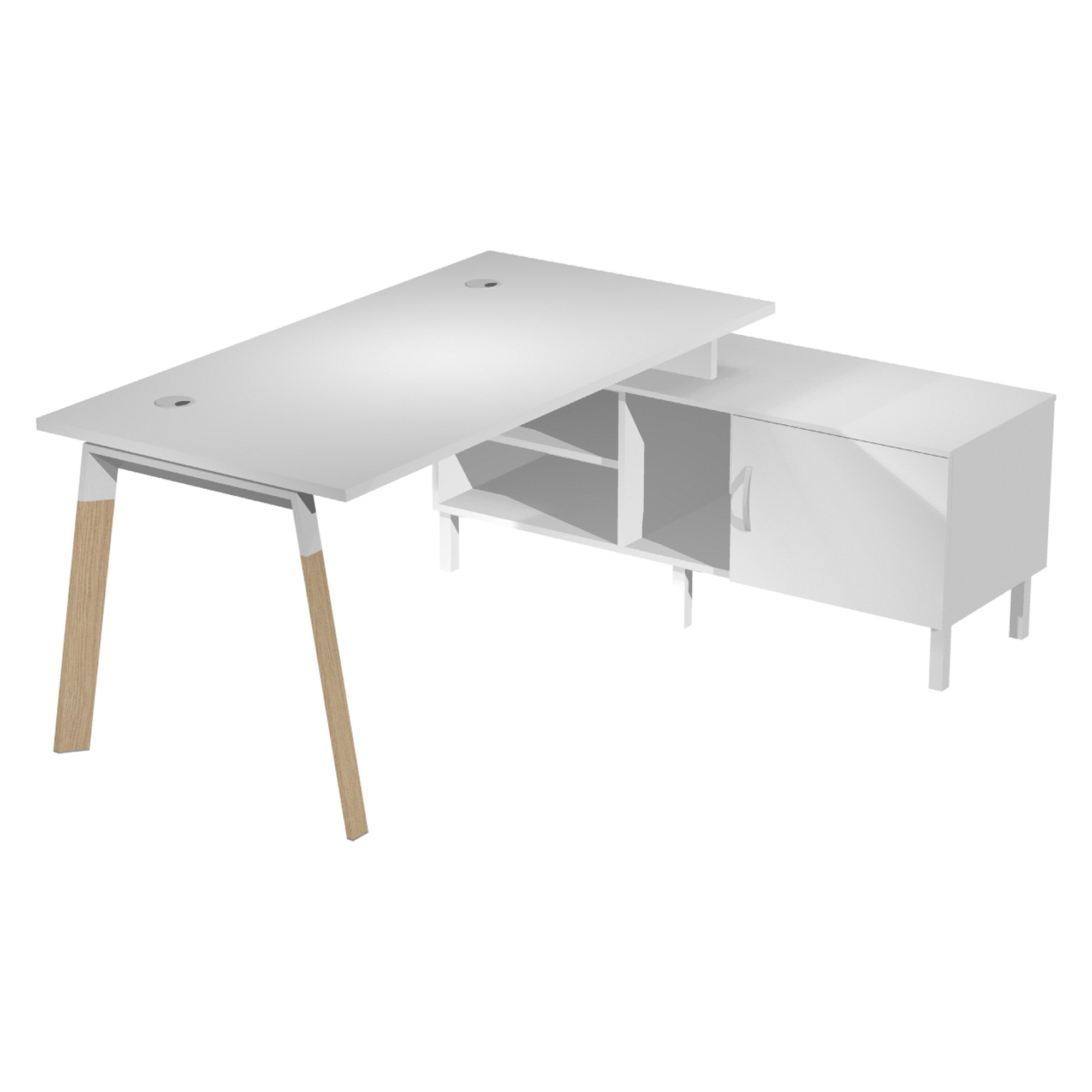 Innovative and dynamic design with inclined legs in white metal or white-oak metal-wood in trapezoidal shape. Tabletop thickness of 25 mm with 2 mm thick ABS edges without sharp corners, available in two finishes: white and oak, and 4 sizes: 120, 140, 160, and 180 cm. Managerial desk with a built-in service unit that can be reversible to the right or left during assembly, and two cable grommets with a diameter of 80 mm. Made of scratch-resistant and glare-free melamine, E1 class, FSC certified with over 90% recycled raw material. The desk can be coordinated with other components of the line: CPU holder, skirt, meeting table, service unit, drawer units, low, medium, and high cabinets. 5-year warranty on resistance, solidity, and quality of the materials used. Delivery within 10 working days. Assembly upon request by contacting customer service at the number 02/82285555 or at the email address progetti@bruneau.it.