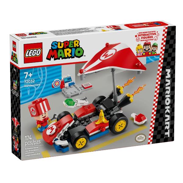 Preparati a gareggiare, derapare e volare sul Kart standard con questo playset per bambini (72032). Un’entusiasmante idea regalo LEGO® Super Mario™ per il compleanno di bambini, bambine e gamer dai 7 anni in su, il set include un modello costruibile del Kart standard di Mario Kart™, una postazione di lavoro con un bersaglio e un personaggio giocattolo di Toad (pit stop) in tuta rossa da meccanico. Il Kart standard è dotato di un Superplani staccabile, ruote da drifting e una funzione di lancio per sparare gusci contro il bersaglio nella postazione di lavoro.