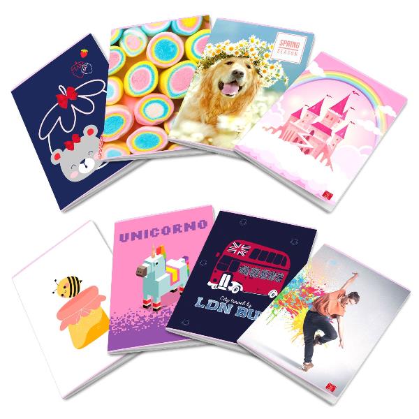 Detailled descriptionMaxiquaderno rilegato con punto metallico. Copertina in cartoncino da 205gr verniciatura UV. Risguardo personalizzabile stampato fronte e retro. Fantasie assortite 2023.