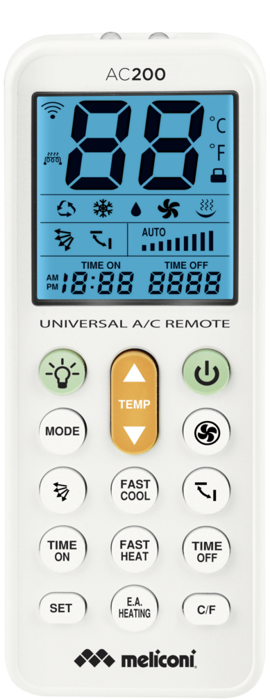 Detailled descriptionMeliconi AC200. Brand compatibility: Universal, Remote control proper use: Air conditioner, Input type: Press buttons. Built-in display