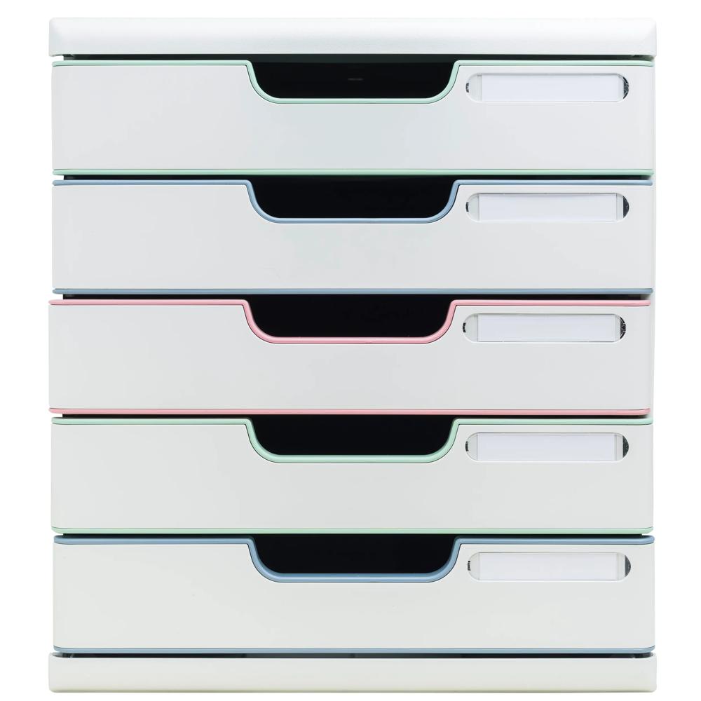 The best of design combined with the best of eco-responsibility. A perfect white made from plastic waste. The Autentik range therefore offers products that bring used plastics back to life. An Exacompta innovation. With Scandinavian influences and colours white, candy pink, sage and grey blue, this range will blend into workplace interiors and home offices alike. The Modulo is an elegant and functional filing system composed of 5 drawers for filing A4 and A4+ format documents, 24x32cm elasticated pockets, large format envelopes and even lever arch files, thanks to its high drawer height. It is suitable for office or school use. The modulo can be juxtaposed and stacked thanks to the included fixing clips. They feature interchangeable drawers, whatever the model. The drawer fronts are closed to keep documents dust-free. The drawers are pleasant to use, sliding and silent, thet are equipped with a safety stop. Respectful of the environment, this product is made of recycled plastic from household waste and is therefore Blue Angel certified. 25 year warranty.