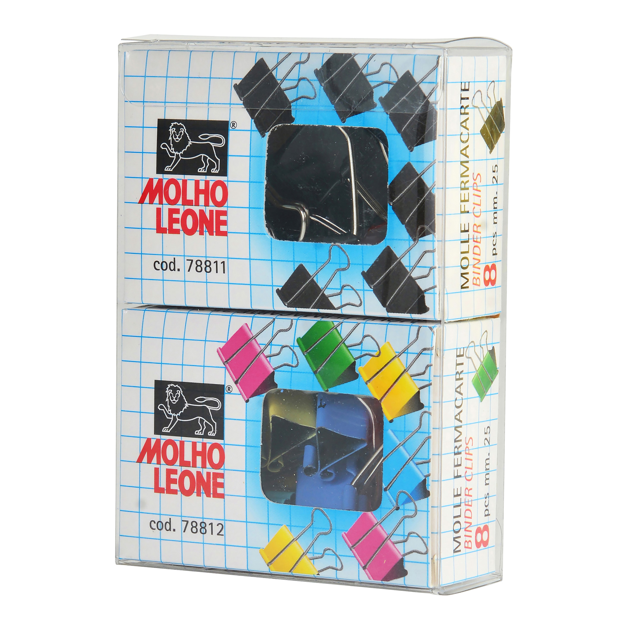 Detailled descriptionMolle fermacarte a doppia clip. 2 scatole con 8 molle da 25mm, 8 nere e 8 colori assortiti.