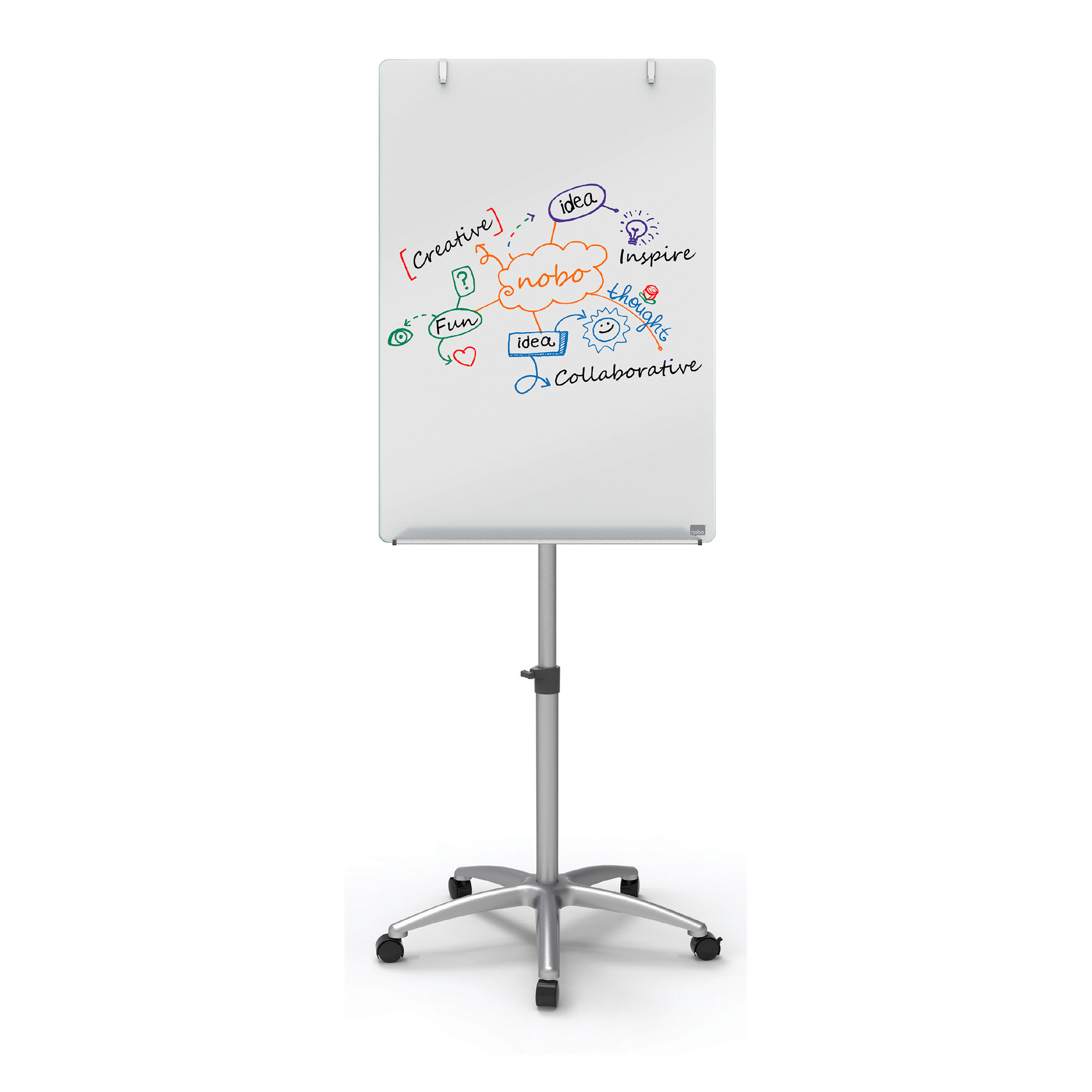 This glass mobile easel has a contemporary stylish design with height adjustable mobile base. Hooks are included to hang a Nobo flipchart paper pad while this board even comes supplied with a Nobo dry wipe marker.