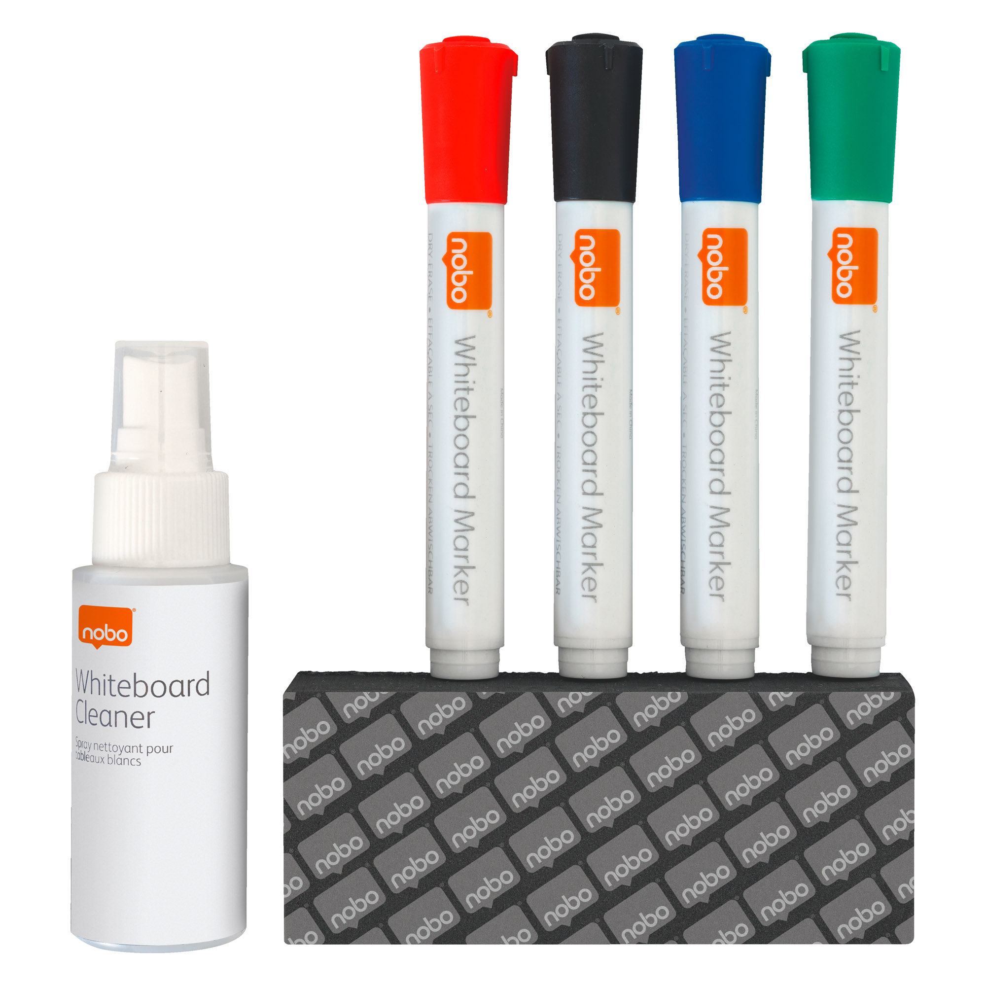 Il kit di pulizia per lavagne bianche Rexel consente di mantenere le lavagne in condizioni ottimali nelle sale riunioni, negli uffici, a casa e in classe. Contiene quattro pennarelli cancellabili a secco dall'odore discreto (nero, rosso, verde e blu), un cancellino in schiuma e uno spray per la pulizia.