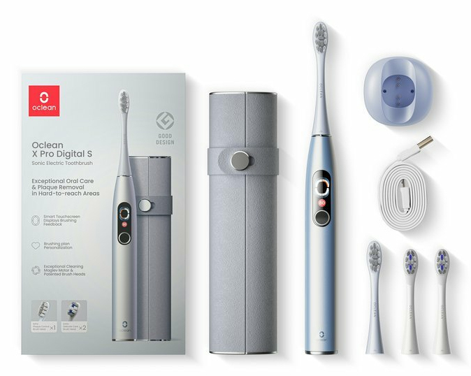 Oclean X PRO DIGITAL SET. Purpose: Adult, Toothbrush type: Sonic toothbrush, Teeth brushing modes: Daily care, Deep clean. Power source: Battery, Battery type: Built-in battery, Battery technology: Lithium-Ion (Li-Ion). Width: 24 mm, Depth: 24 mm, Height: 248 mm. Number of handles included: 1 pc(s), Number of brush heads included: 2 pc(s)