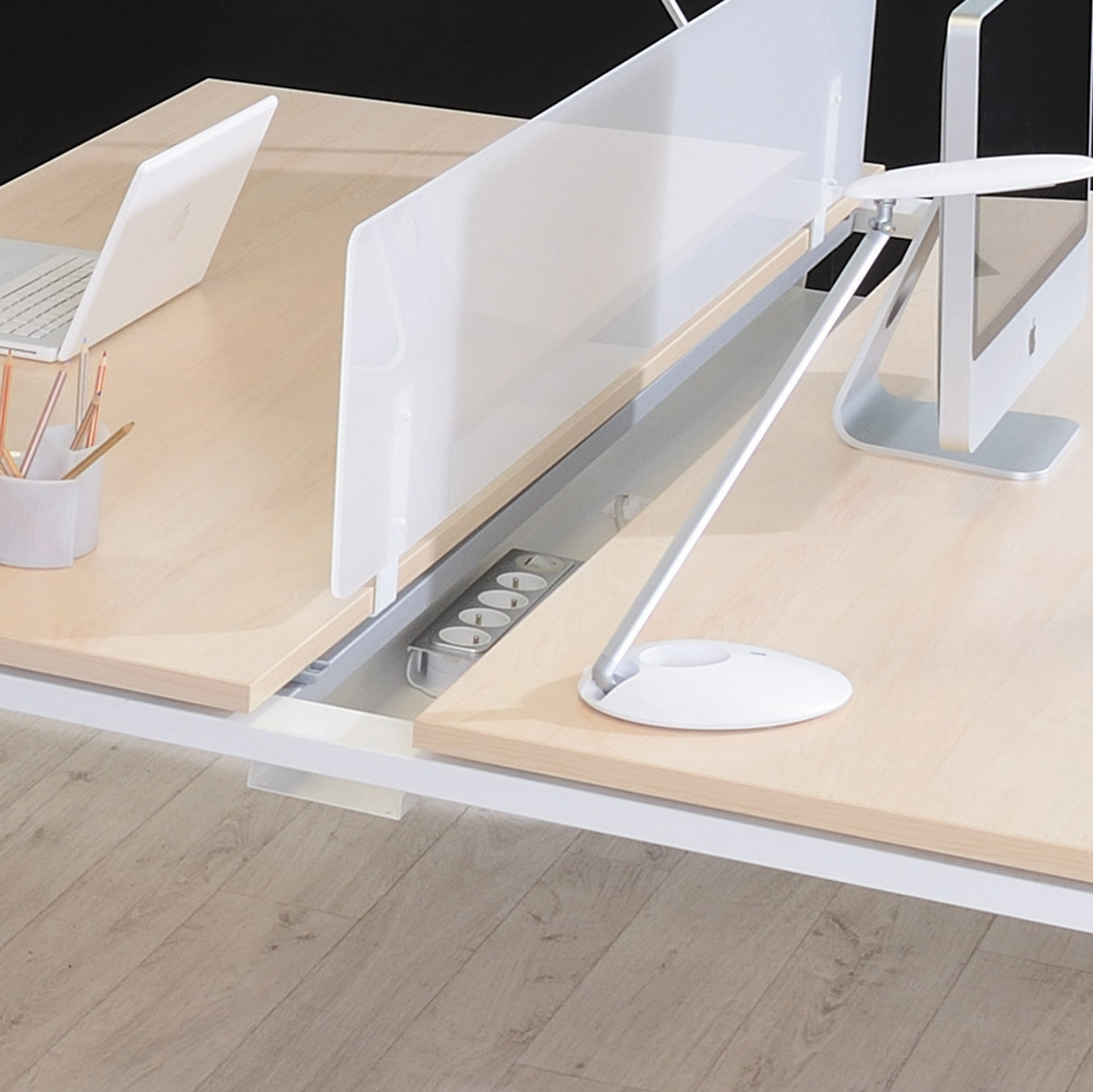 Il pannello può essere installato sotto la scrivania come gonna o sopra la scrivania come pannello divisorio.