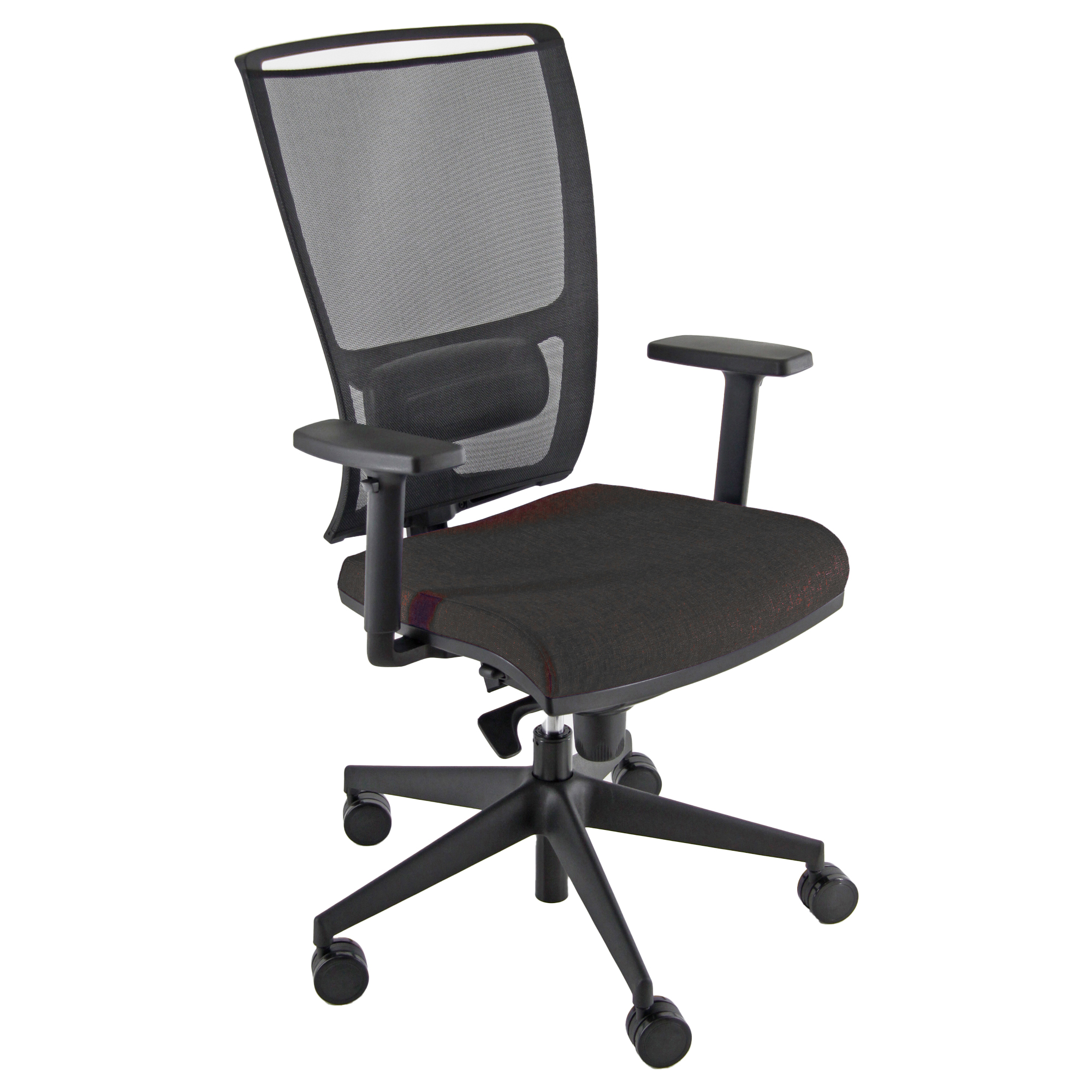Poltrona semidirezionale H12 (adatta per uso intenso). Schienale alto in rete nera con supporto lombare regolabile. Rivestimento seduta in acrilico ignifugo. Braccioli regolabili e base in nylon. Meccanismo syncro. Meccanismo anti shock, meccanismo a contatto permanente. Schienale regolabile up-down. sedile con traslatore regolabile in profondità. Elevazione a gas.