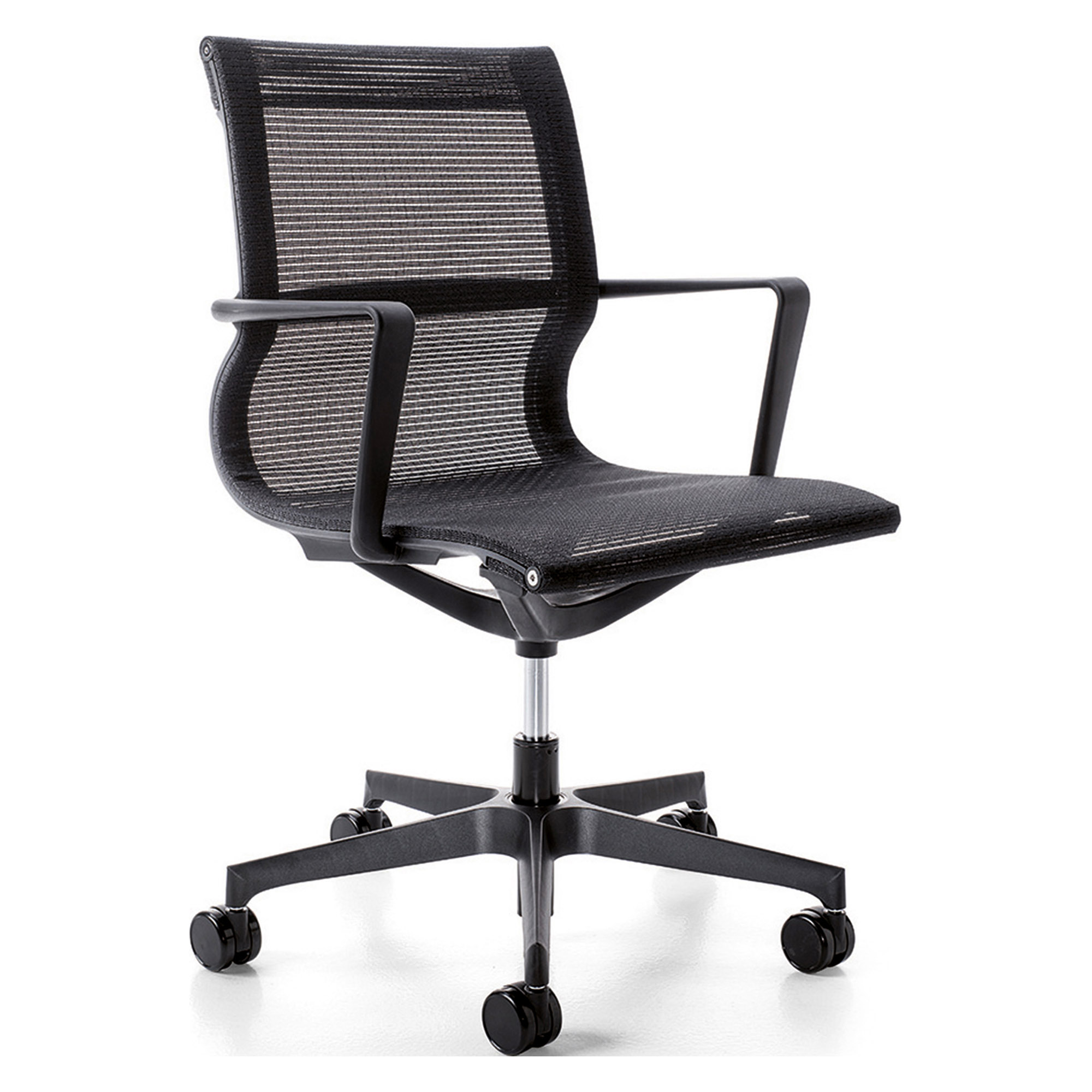Poltrona linee slim, design ultraleggero. Struttura in rete portante rivestita. Schienale fisso. Elevazione a gas. Meccanismo oscillante libero.