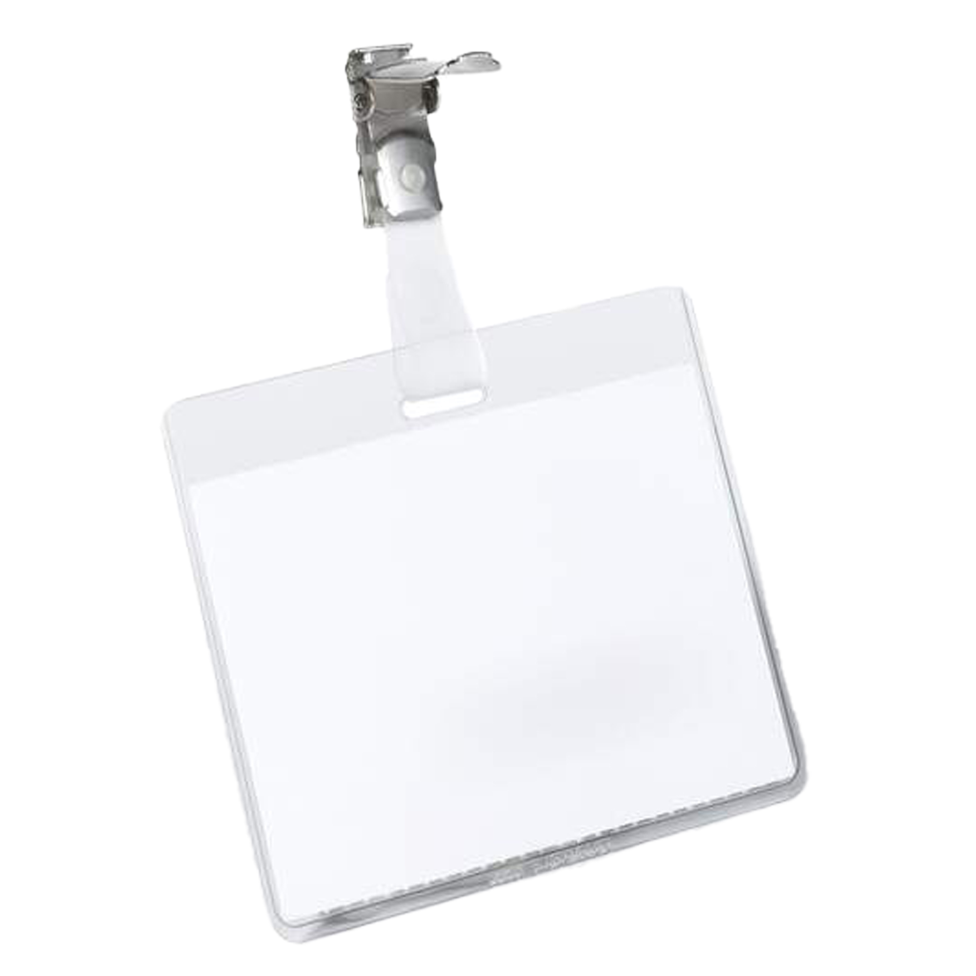 Portanome con clip in metallo orientabile che, una volta agganciata, evita la fuoriuscita accidentale dell'inserto.