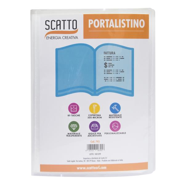 Detailled descriptionPortalistinoMateriale: Polirpropilene satinatoDimensioni: 25,5x31 cm - 350 MICRONColore: trasparenteIdeale per A4Ideale per archiviareCopertina personalizzabile