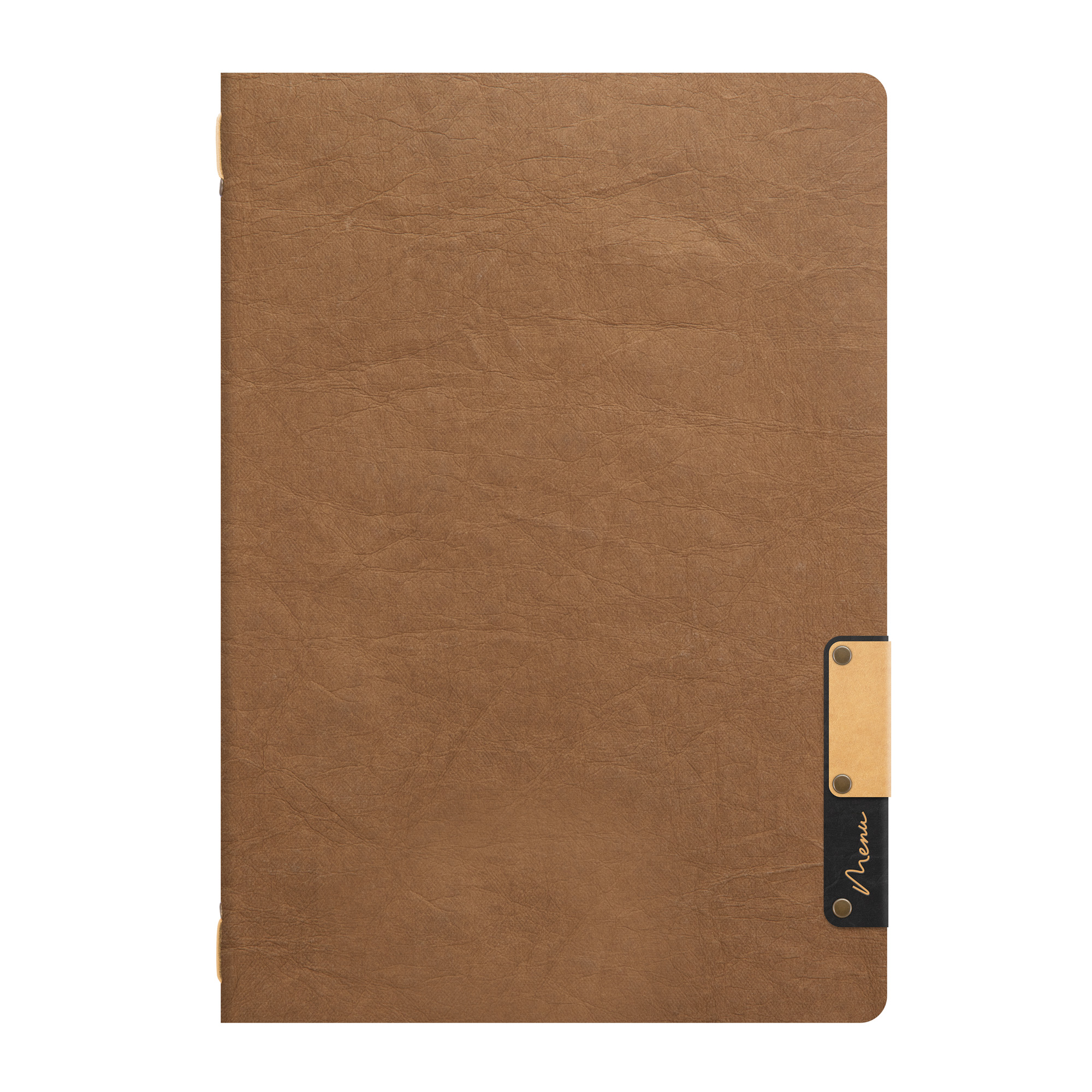 Porta menù in fibra naturale al 100% impermeabile. Facile da pulire con acqua e sapone. Comprende 1 inserto doppio interno (per 4 fogli) in plastica trasparente, trattenuto da un elastico sul dorso. Dimensioni: 24,5 x 34cm. Può contenere fino a 10 inserti doppi per un totale di 40 facciate.