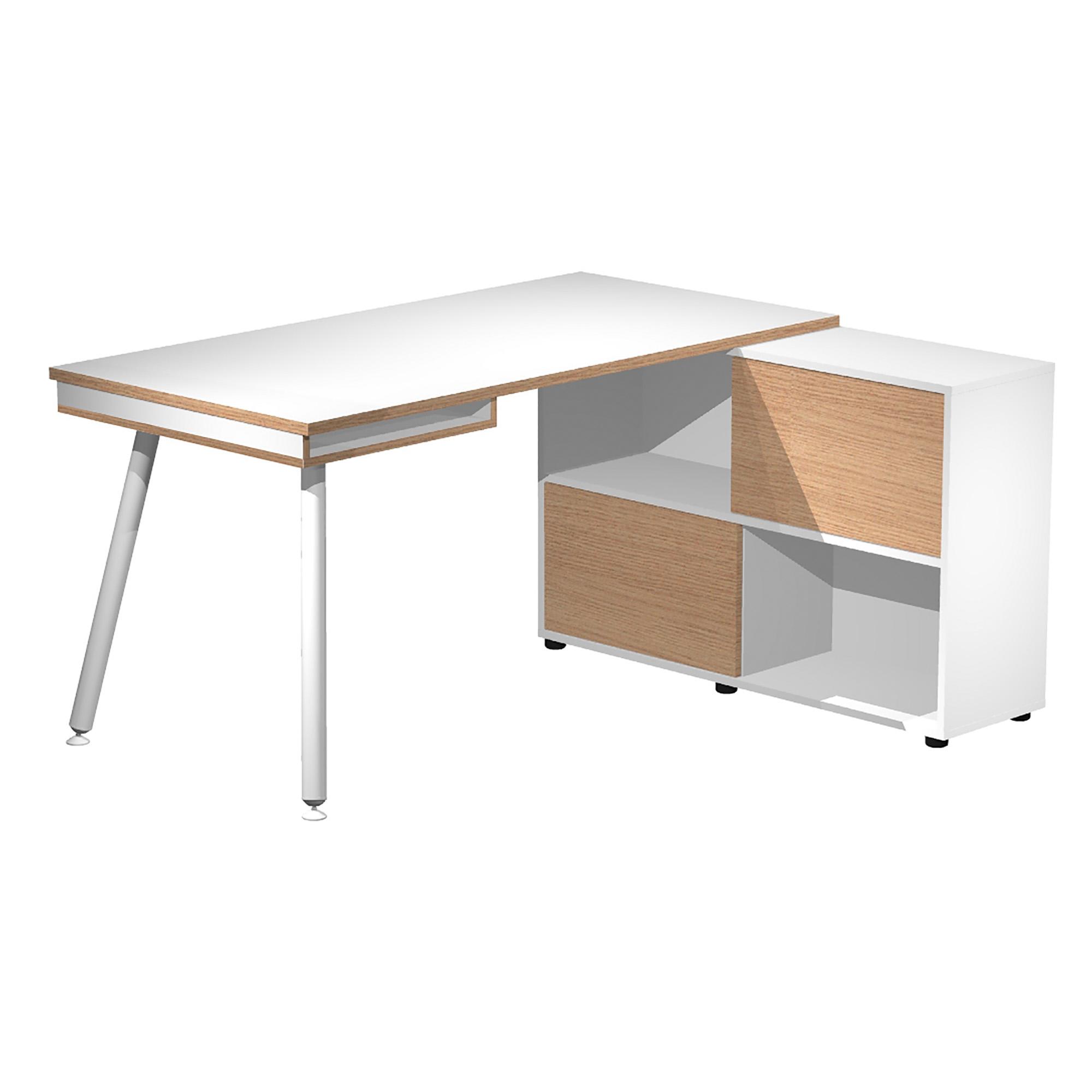 Postazione di lavoro compatta, ideale per l’home-office, con design e finiture di ispirazione scandinava. L’ampio piano di lavoro è sorretto da un lato da un pratico mobile di servizio portante a quattro vani completo di due ante scorrevoli e piedini regolabili in altezza e dall’altro da una coppia di gambe in metallo o da una coppia di gambe in legno massello, entrambi con piedini livellabili in altezza.