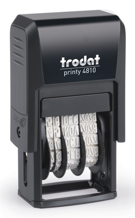 Detailled descriptionTrodat 4810. Product type: Self-Inking, Type: Date stamp, Imprint size: 21 x 3.8 mm. Width: 41 mm, Depth: 25 mm, Height: 73 mm. Quantity per pack: 1 pc(s), Package volume: 92000 cm³, Package width: 44.5 mm