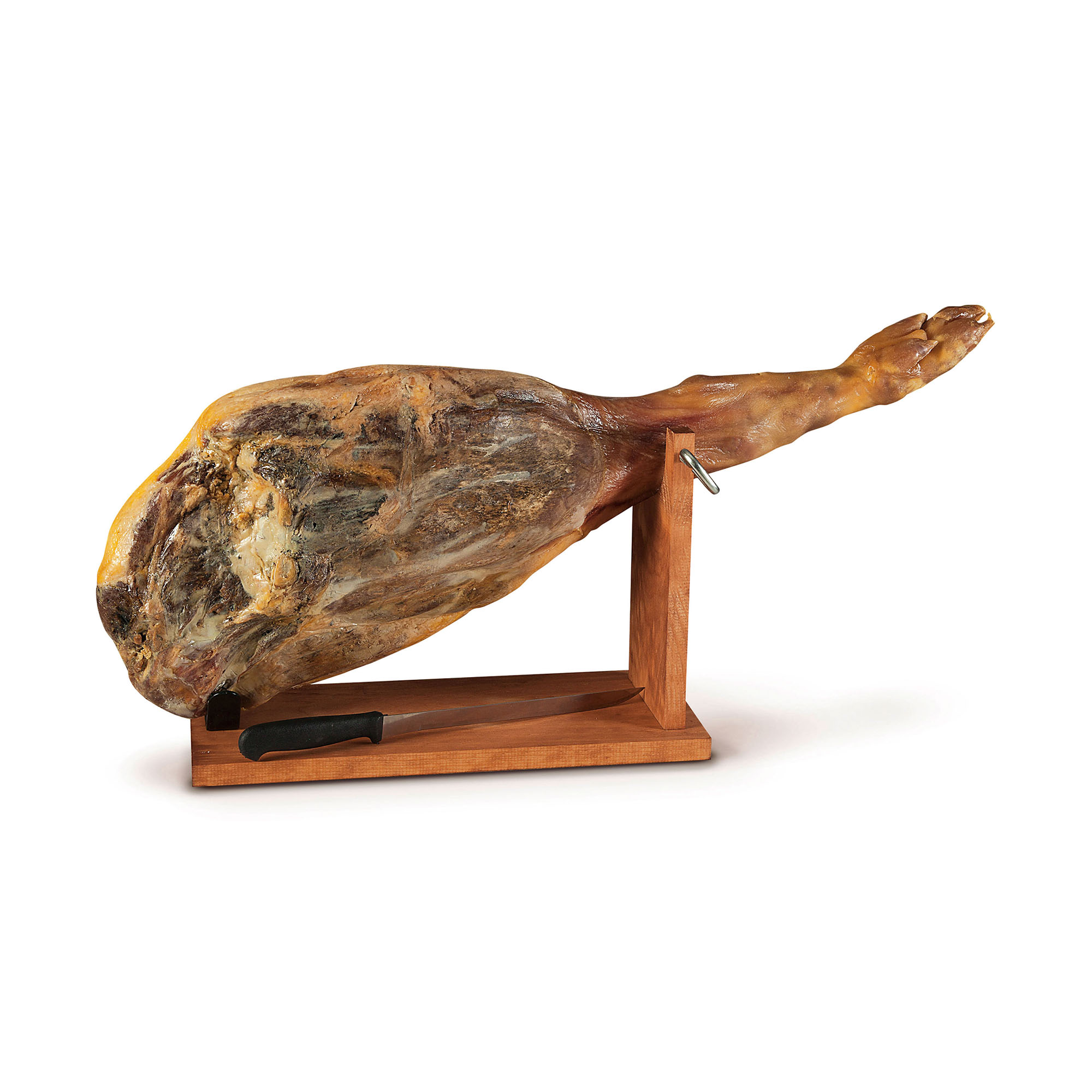 Il jamón serrano (letteralmente "prosciutto di montagna") è un salume ottenuto dalla salatura e seccatura all'aria delle cosce posteriori del maiale di razza bianca. Il processo di stagionatura è un mestiere che richiede l’esperienza e la cura dei maestri artigiani e questo lavoro viene svolto nelle catene montuose spagnole dove si trovano le esatte condizioni di temperatura e umidità di cui i prosciutti hanno bisogno per essere affinati al meglio. La confezione regalo include un coltello e un tagliere per affettare a mano il prosciutto, attività che oltre ad essere piacevole è anche la migliore per poter consumare questo salume. Il maggior problema del taglio a macchina infatti è la produzione di una frizione e un riscaldamento della superficie del taglio, cioè delle fette risultanti. Questo influisce sul sapore, non permettendo di distinguere le diverse parti da cui provengono le fette: fiocco, cosciotto, garretto e coscia.