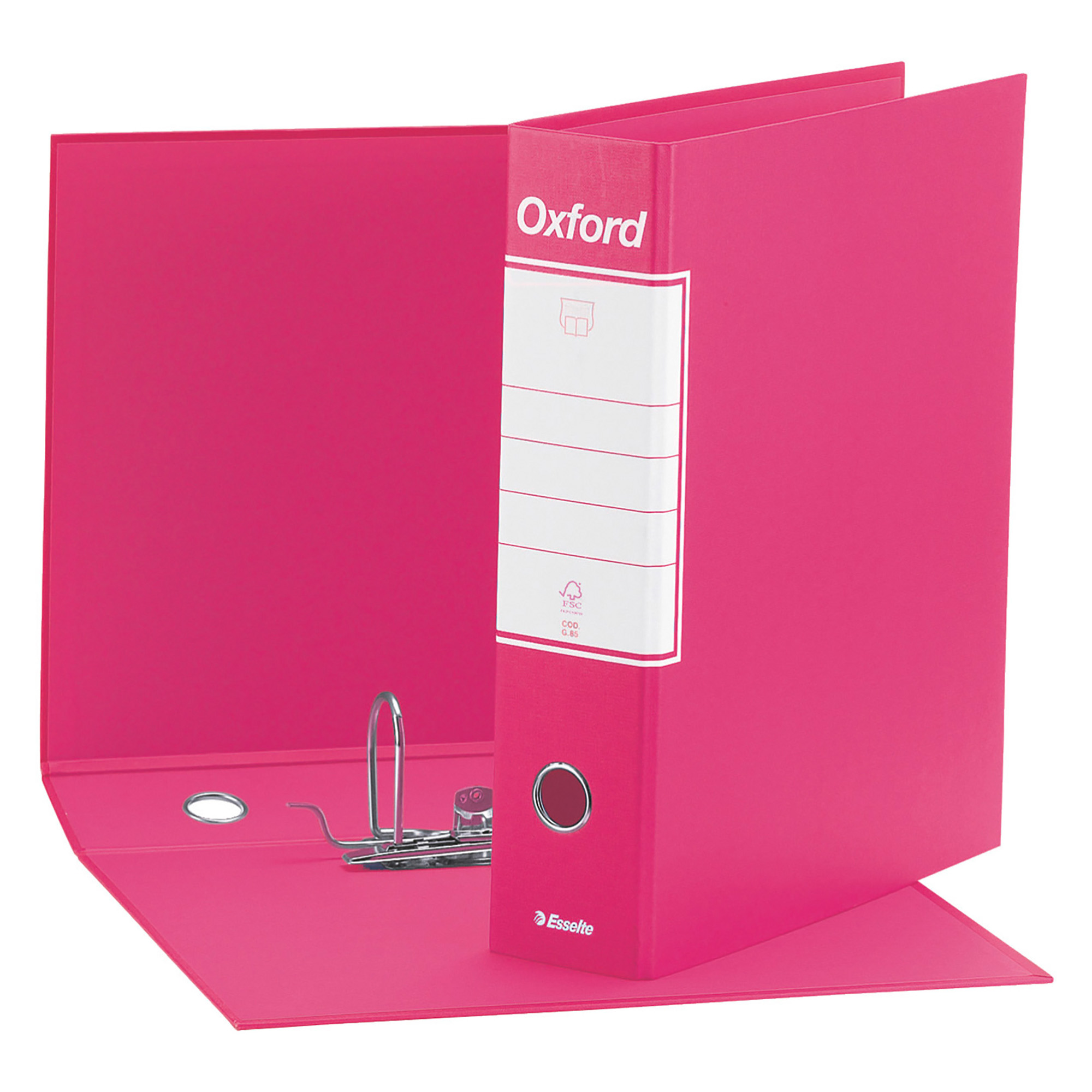 Registratore Esselte Oxford in robusto cartone dotato di meccanismo a leva e pressino con custodia in fibrone profilata in metallo per una maggiore stabilità.