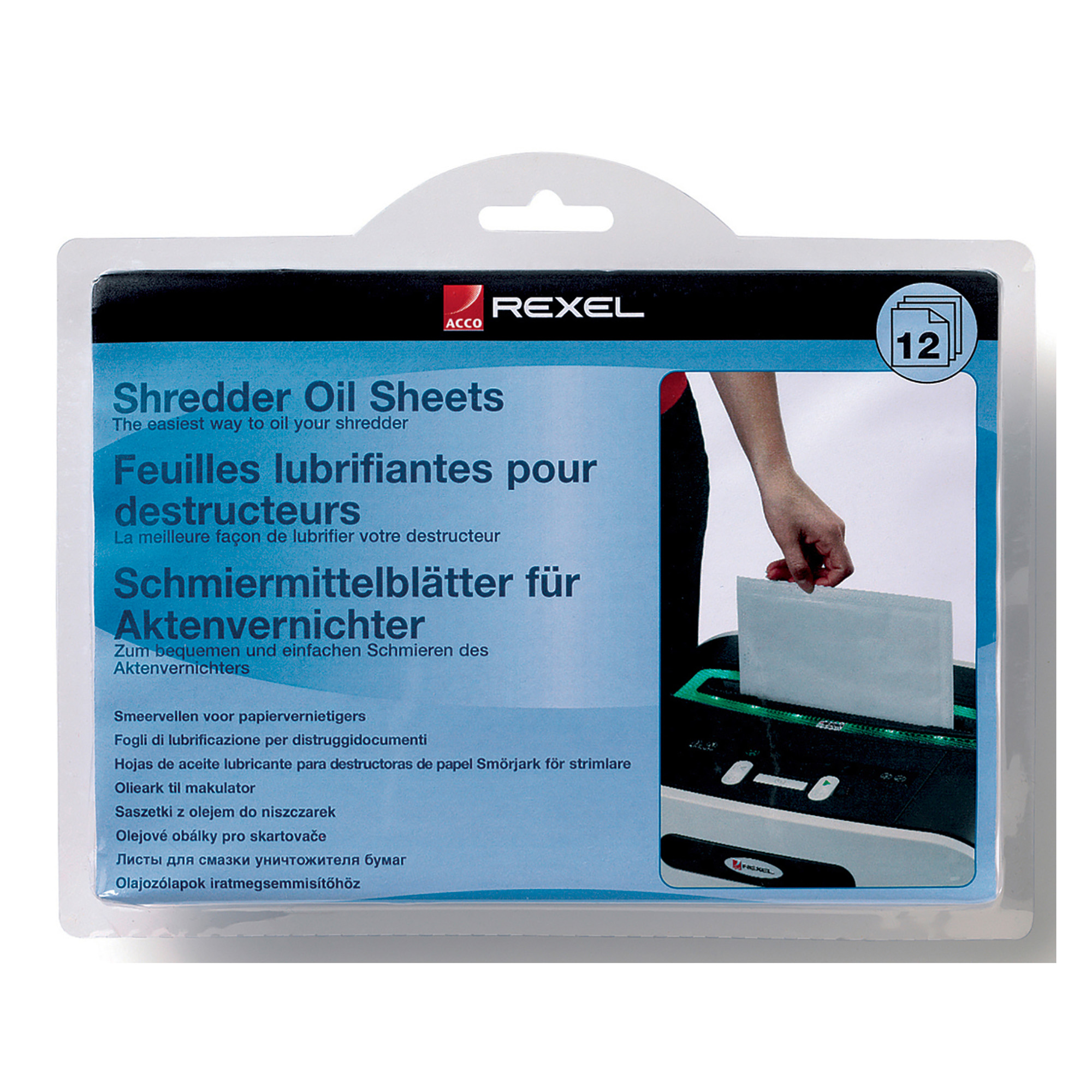 Rexel oil paper 2101948. Spread oil on the cutter. Suitable for all Rexel shredders. Quantity: 12 sheets.