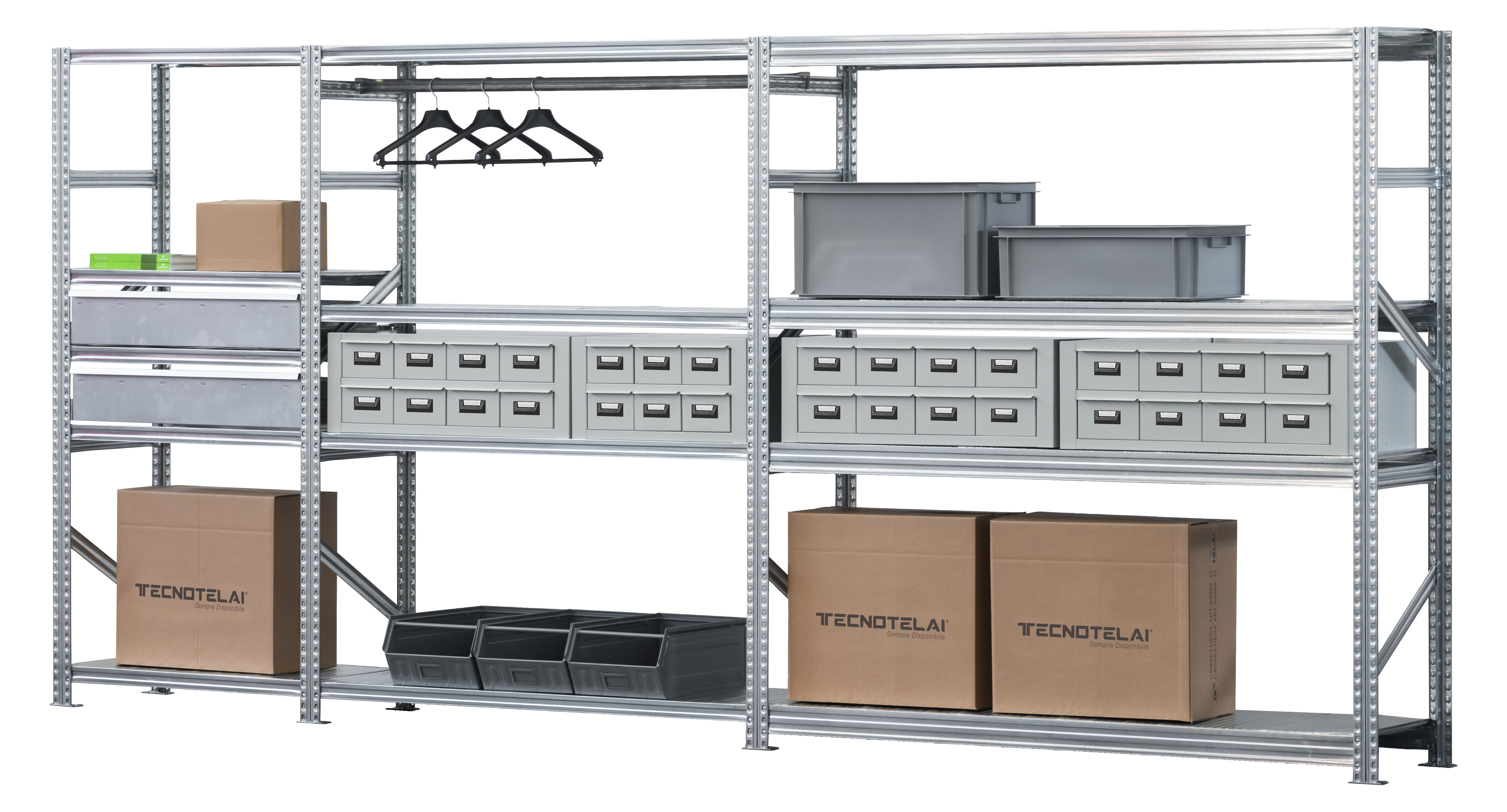 Detailled descriptionScaffalatura ad incastro in lamiera certificata 3.1 e profilata a freddo con acciaio zincato a caldo secondo procedimento SENDZIMIR, adatte a operazioni svolte manualmente. Kit iniziale 1200x500x1972h 4 piani (misura lunghezza effettiva 1306x500x1972h) Campata iniziale composta da: n.2 art.S1340N fiancate smontate 1972x500 con 2 montanti sp.12,5/10, 2 traversini, 2 diagonali, 2 basi e 2 tasselli a pavimento. Portata nominale kg.2000. n.4 art.S1575 piano 1200x500 con 2 correnti mm.47h sp 5/10, 2 pianetti di 600x600x12h sp.4/10 e 4 ganci di sicurezza. Portata nominale kg.220 cad. n.4 art.S1310 staffe fissaggio muro, tasselli esclusi