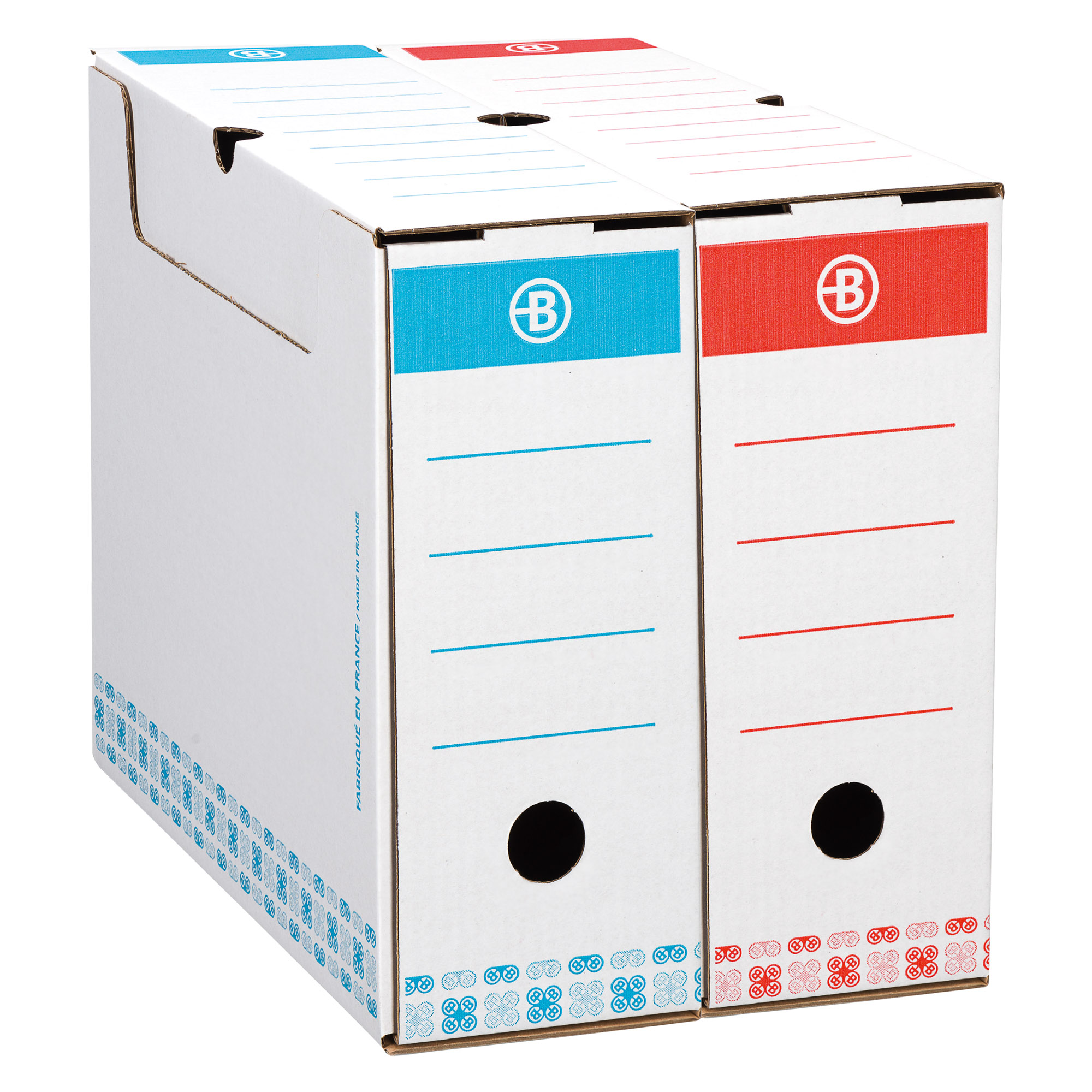 Identificazione facile e rapida del contenuto e una possibile archiviazione anche per colore grazie alle stampe a colori ben visibili: blu e rosso. Ideale per documenti fino al formato 24 x 32 cm.
