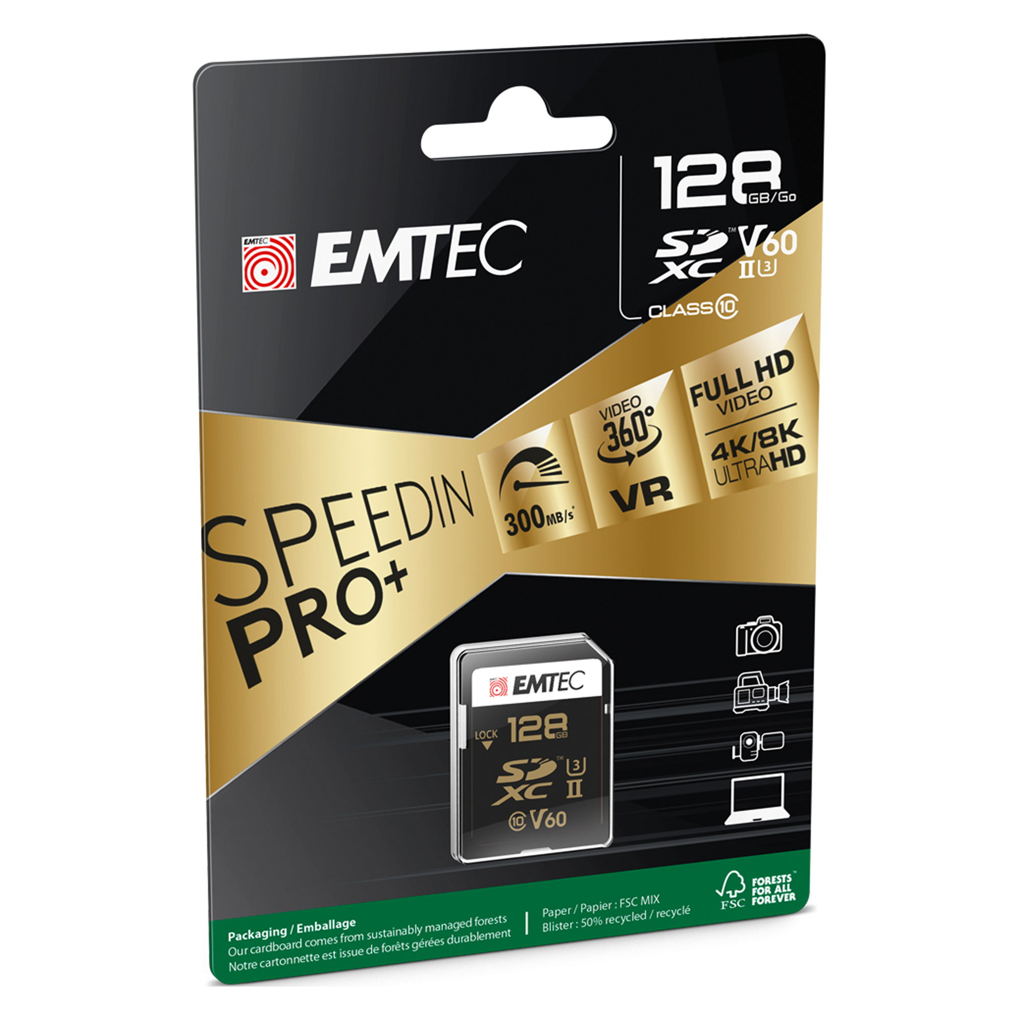 SD UHS-II U3 V60 SpeedIN PRO+ Schede UHS-II ultraperformanti, per professionisti e utenti avanzati La scheda di memoria Emtec SDXC UHS-II U3 V60 offre prestazioni incredibili per il download, il trasferimento e la condivisione di app, foto e video. La classe di velocità video V60 garantisce la facile identificazione di un dispositivo compatibile. Ideale per riprese continue ad alta velocità, video full HD, 3D, 4K e persino 8K UHD
