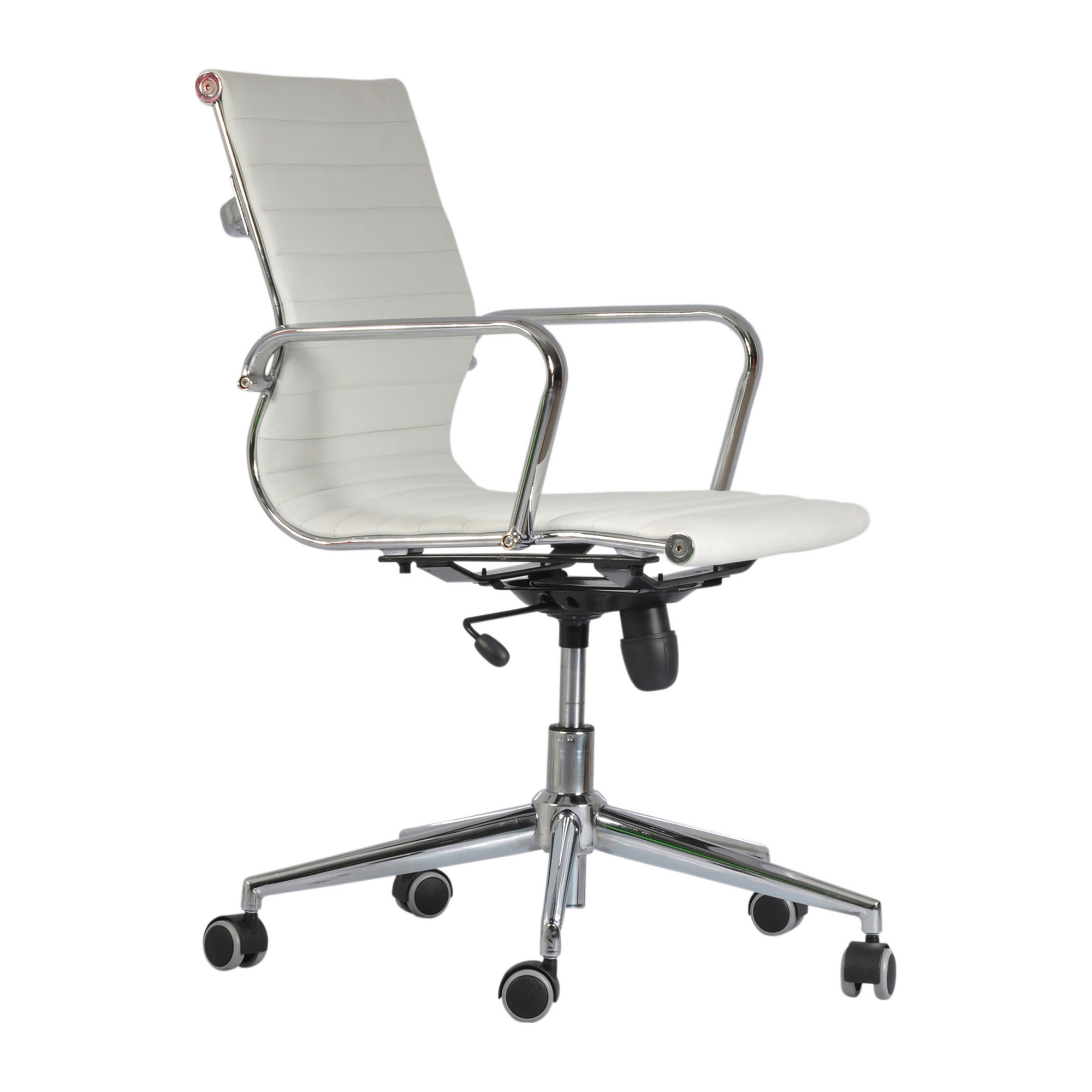 verniciato nero inclusi. DIMENSIONI: schienale alto 64 cm; schienale basso 44 cm; largh schienale 46 cm; largh seduta 56 cm x prof 47 cm; alt regolabile da 46 a 56 cm, alt tot vers schienale basso da 98 a 108 cm, ruote autofrenanti Ø 50 mm, Ø base 70 cm.
