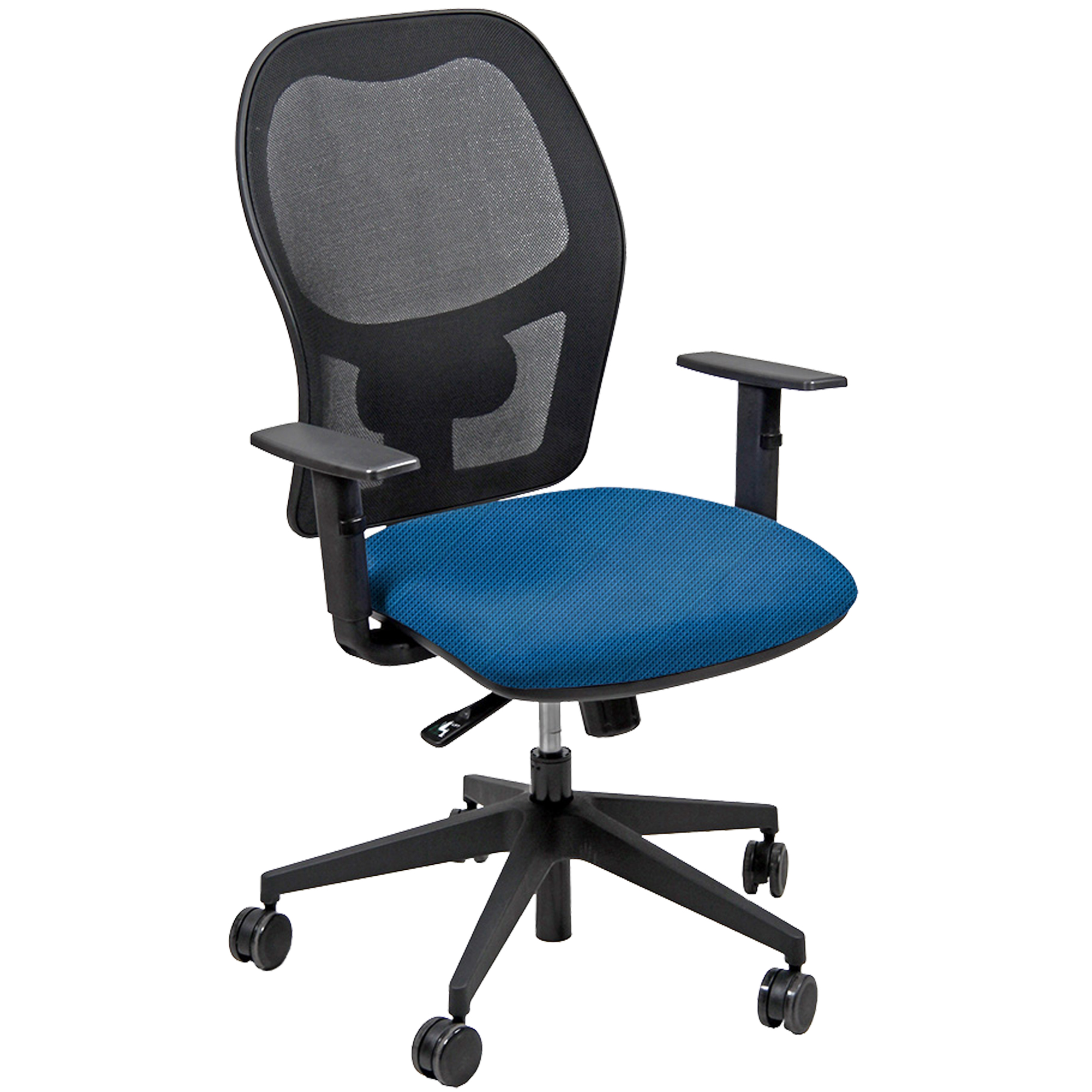 Seduta operativa girevole con elevazione a gas, meccanismo syncro, 4 blocchi anti shock e meccanismo a contatto permanente. Schienale con supporto lombare regolabile. Completa di braccioli regolabili. Rivestimento in tessuto "SUPER - Target" 100% poliestere idrorepellente antimacchia e reazione al fuoco classe 1. Alt.tot: 102-113cm; Prof.tot: 68cm; Alt.schienale: 60cm; Largh.schienale: 48cm; Largh.sedile: 48cm; Prof.sedile: 46cm; Alt.sedile: 42-54cm.