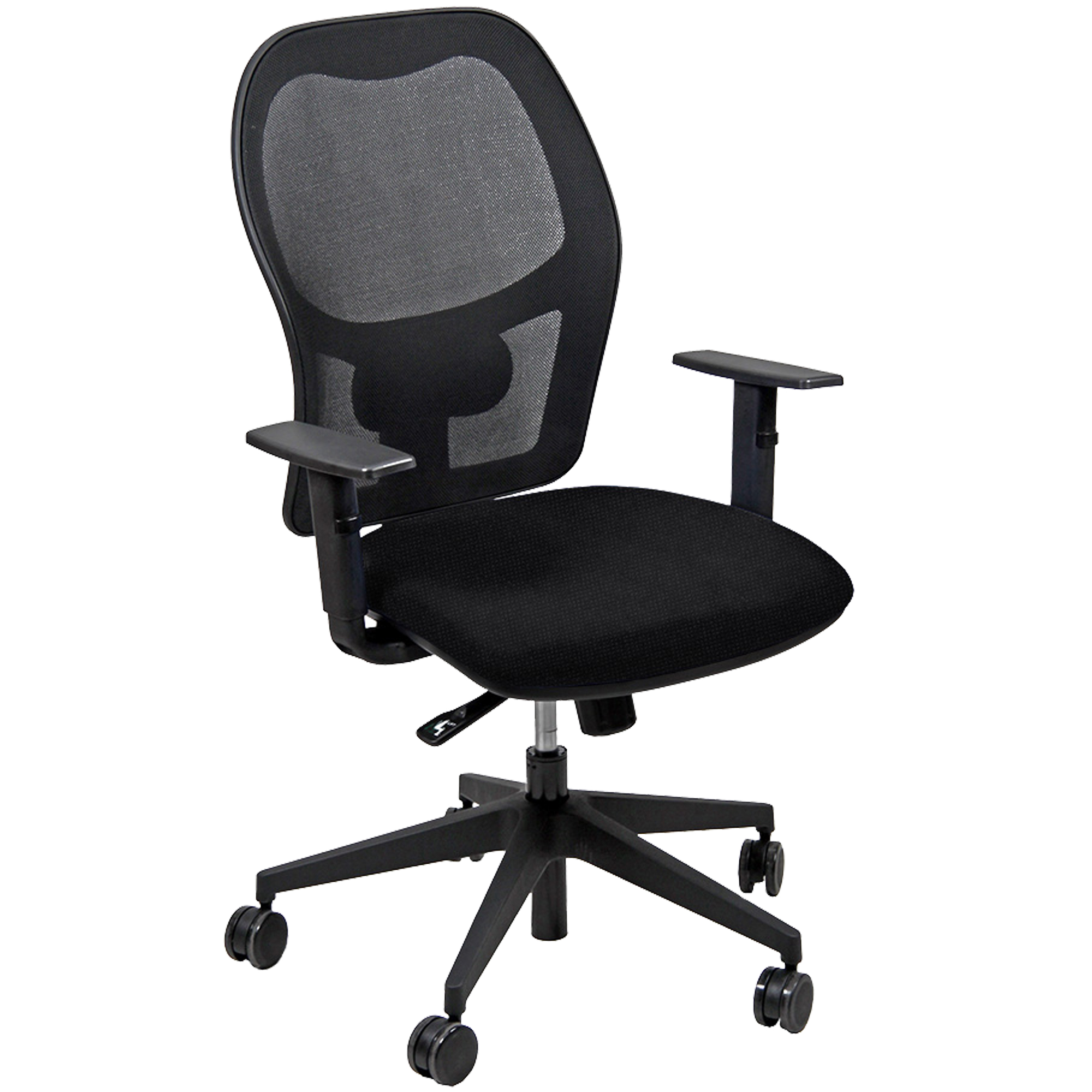 Seduta operativa girevole con elevazione a gas, meccanismo syncro, 4 blocchi anti shock e meccanismo a contatto permanente. Schienale con supporto lombare regolabile. Completa di braccioli regolabili. Rivestimento in tessuto "FASHION - Chili" 75% poliestere riciclato e certificazione di infiammabilità 1IM. Alt.tot: 102-113cm; Prof.tot: 68cm; Alt.schienale: 60cm; Largh.schienale: 48cm; Largh.sedile: 48cm; Prof.sedile: 46cm; Alt.sedile: 42-54cm.