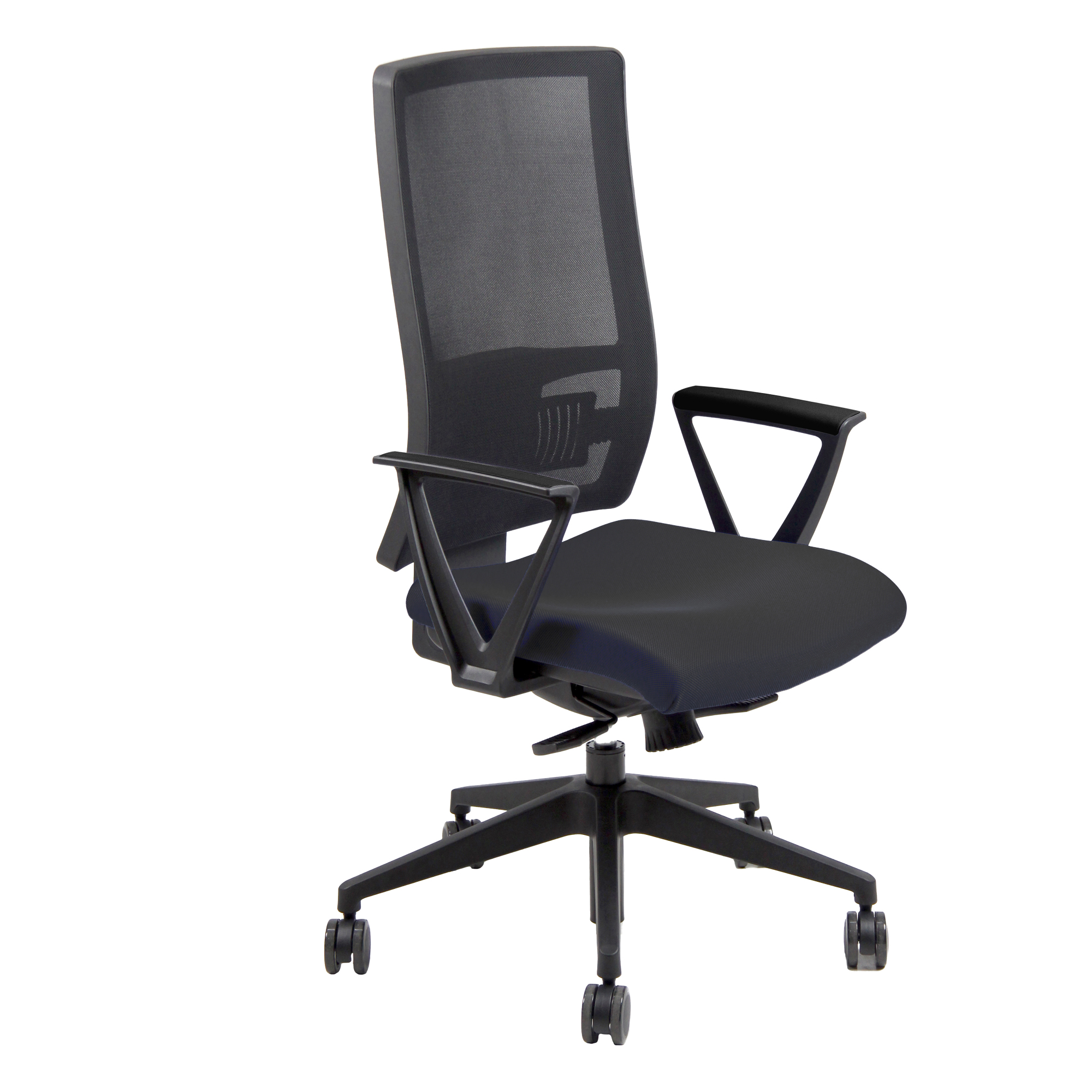 Detailled descriptionPoltrona con schienale alto in rete nera con supporto lombare. Rivestimento in tessuto Eco con trattamento ignifugo, meccanismo sincronizzato con contatto permanente, elevazione a gas e braccioli in polipropilene.