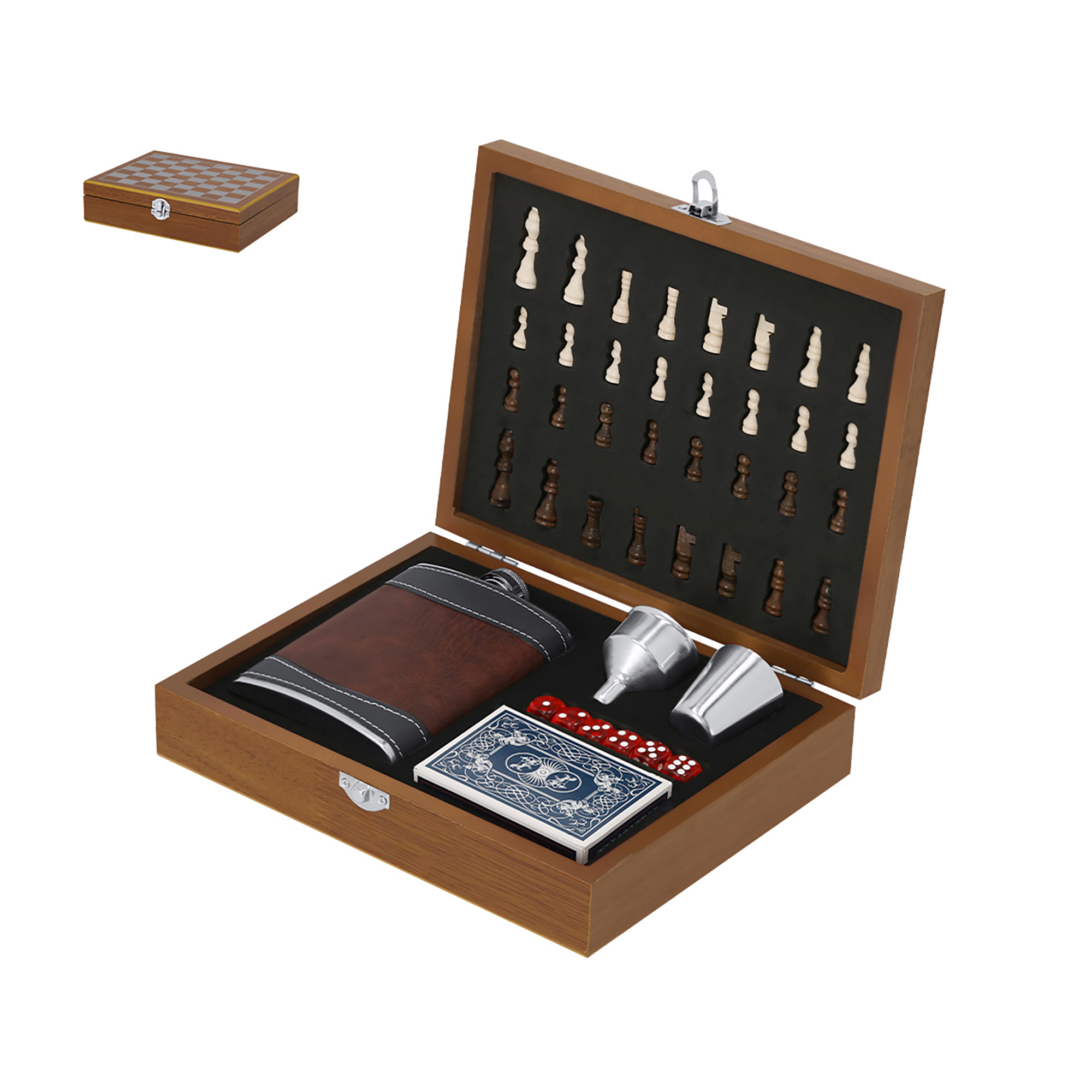 Detailled descriptionSet Fiaschetta MenzieSet originale di flask con finitura in legno e design a scacchi. Include chiusura di sicurezza e accessori in acciaio inossidabile rivestiti in PUContiene una flask di 220 ml con tappo a vite antigoccia, un bicchierino, un pratico imbuto, un mazzo di carte da poker e sei dadi rossi Presentato in una elegante custodia con scacchiera e un interno in schiuma sagomata Incorpora 16 pezzi di scacchi in colore beige e 16 in marroneLegno