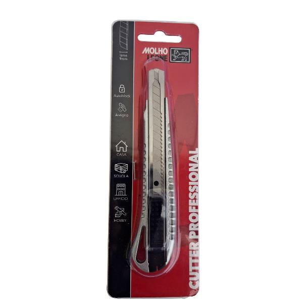 Cutter con lama 9 mm autobloccante, struttura in alluminio, guida lama in acciaio ed impugnatura antiscivolo in gomma.