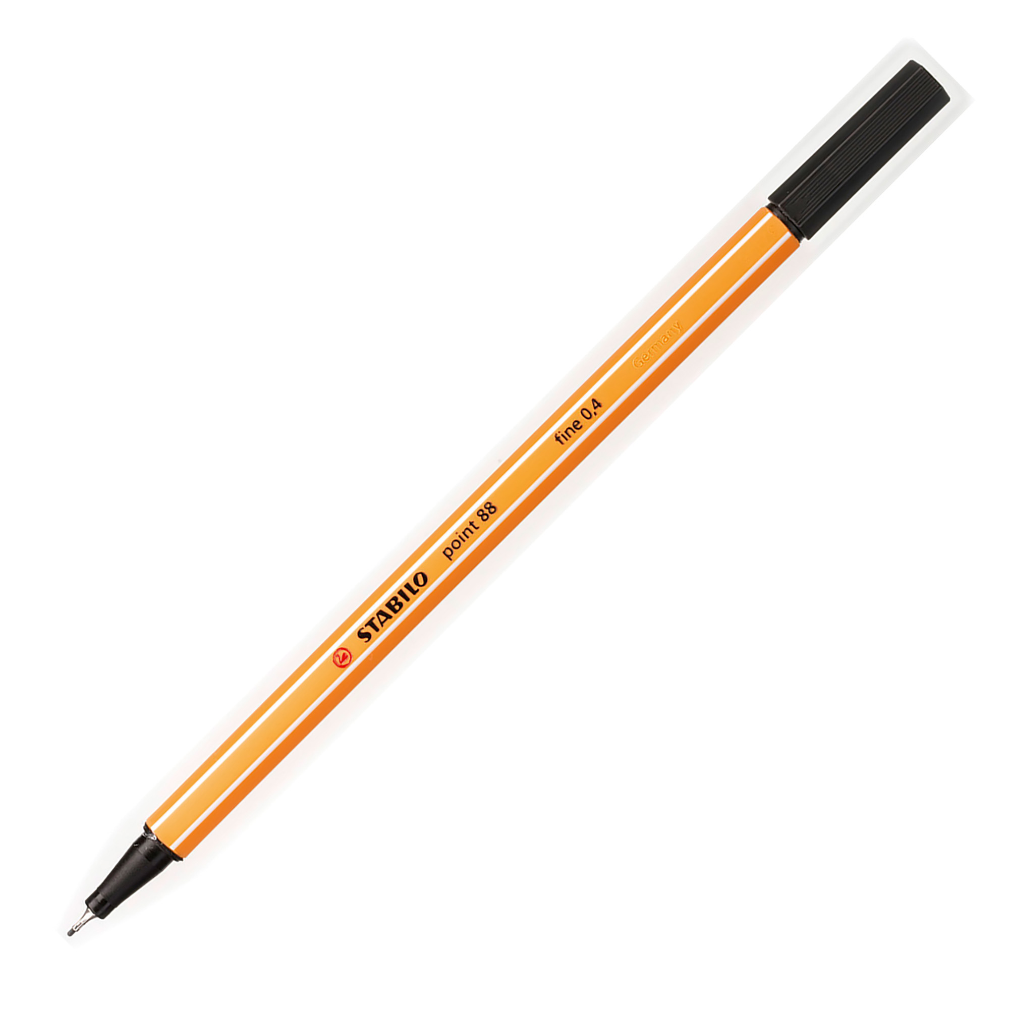 Stabilo fine liner Point 88. Pencil design with white stripes. Contains waterbased ink and the cap is in the colour of the ink. Ink tip: fine Packed in a zebra box. Line width: 0.4 mm. Colour: black. Quantity: 10 pieces.