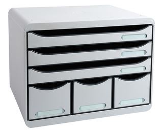 STORE-BOX MAXI 6 drawer set, grey Drawer set with 6 drawers, 3 drawers for storage of A4+ documents and 3 narrow but tall drawers for office stuff. Landscape format : fits perfectly on shallow cupboard or desktops (external depth = 27cm). Ideal for landscape documents like data sheets. Stackable through 4 notches.