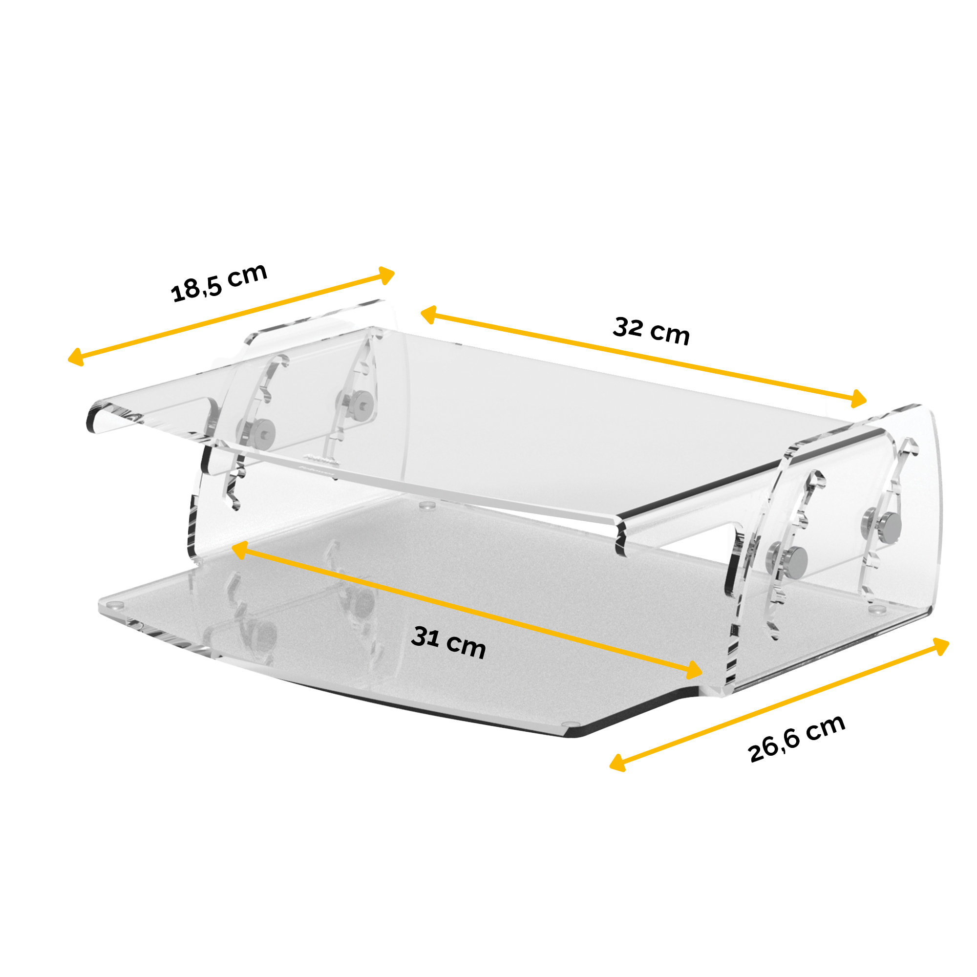 Supporto monitor regolabile Clarity™. Evita di affaticare collo e occhi grazie alle 5 regolazioni in grado di garantire un’altezza di visione ottimale (70/85/100/115/130 mm). Si integra perfettamente in qualsiasi ambiente d’ufficio grazie alla costruzione in acrilico trasparente di qualità spessa 5 mm. Può sostenere fino a un massimo di 10kg di peso. Dimensioni (LxPxA): 32x25,6x7-13cm.