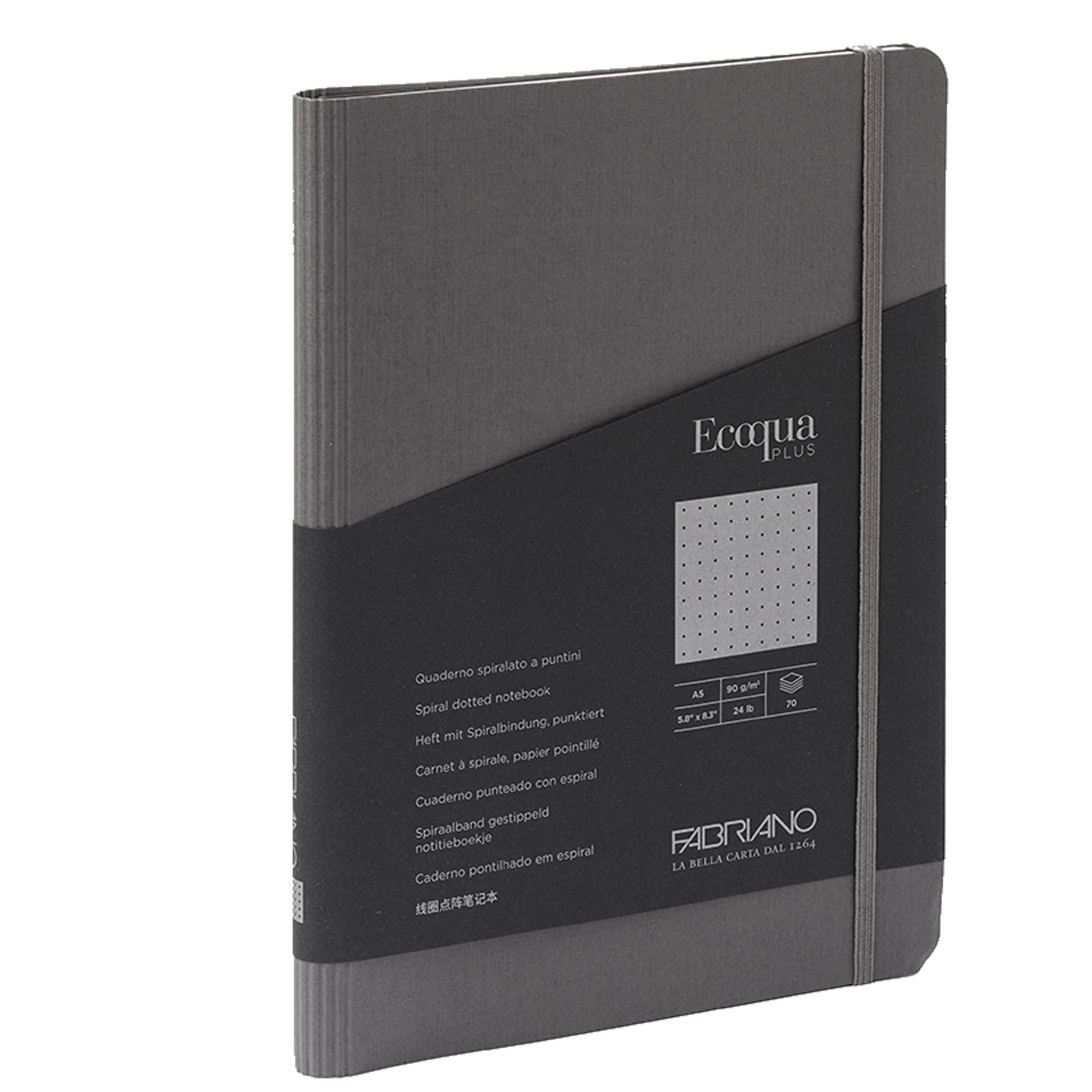 Taccuino Ecoqua Plus - con elastico - spiralato - A5 - 70 fogli - puntinato - antracite - Fabriano