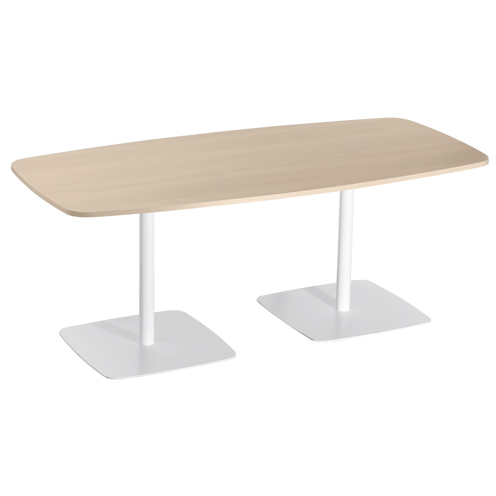 Piano in melamina rovere con trattamento antiriflesso e antigraffio, spessore 22 mm. Angoli arrotondati. Bordo dritto in ABS antiurto bianco. 2 gambe centrali in acciaio 6 mm di spessore con base quadrata curva L 58 x P 58 cm. Base rifinita con vernice epossidica bianca satinata antigraffio.