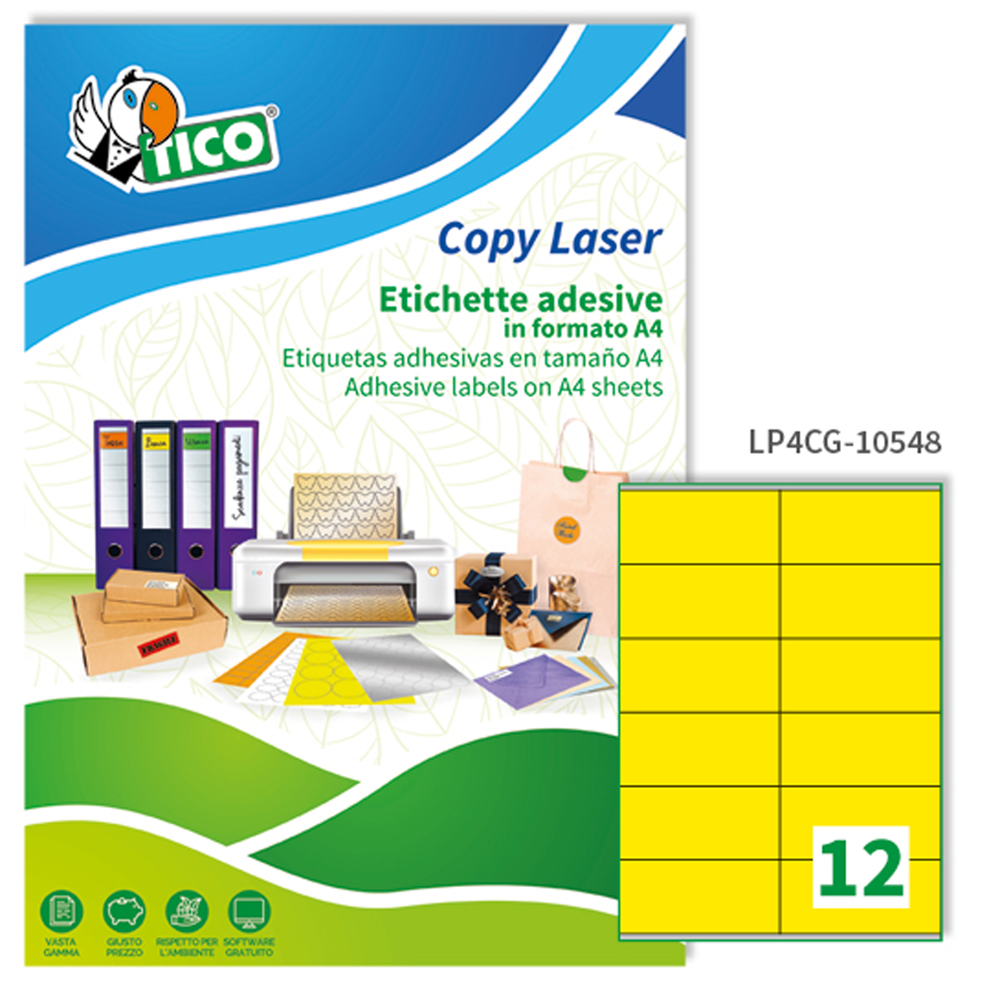 Confezione da 70 fogli di etichette adesive permanente in carta giallo opaca nel formato A4 (210 x 297 mm). Ogni foglio contiene 12 etichette senza margini nel formato 105x48mm. Per stampa: Laser, Inkjet e fotocopiatrici. Ideali per adesivi personalizzati, bollini colorati, etichette promozionali, etichette colorate da stampare, fogli adesivi fustellati. Prodotte in Italia.