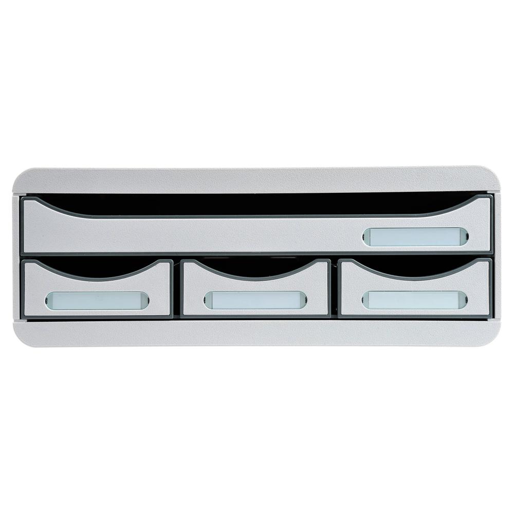 TOOLBOX MINI 4 drawers set, light grey Drawer set with 4 drawers of 43mm height, 1 drawer for storage of A4+ documents and 3 narrow drawers for office essentials Product height is short (13,5cm) in order to let it being used as screen, printer or desktop sorter support. Landscape format : fits perfectly on shallow cupboard or desktops (external depth = 27cm). Stackable through 4 notches.