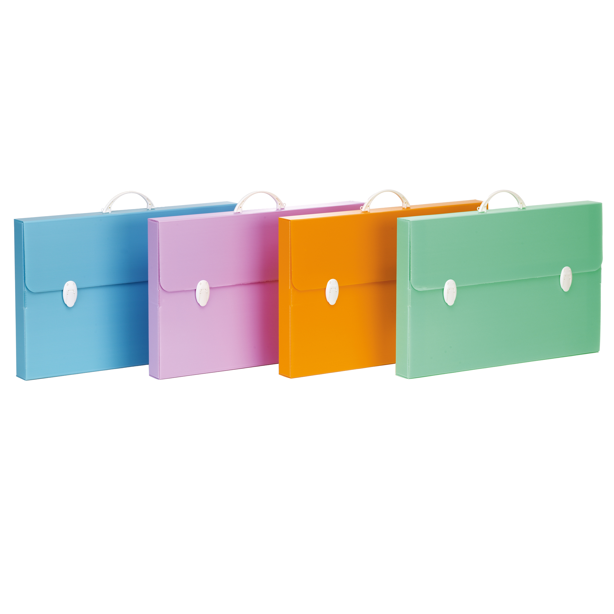 Pastel coloured honeycomb polypropylene briefcase with handle and white closures. Ideal for 24×33 cm and 33×48 cm blocks. The 56.5 cm wide briefcase, can hold a 60 cm ruler. Available in 4 colours: light blue, green, orange, lilac. With protective film or flat with assembled accessories.
