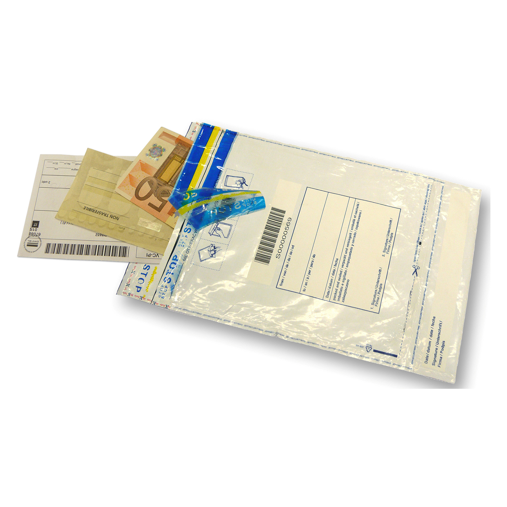 Con nastro adesivo tamper anti-effrazione che evidenzia qualsiasi tentativo di apertura o manomissione. Dorso stampato con codice a barre, scrivibile anche con penna a sfera.