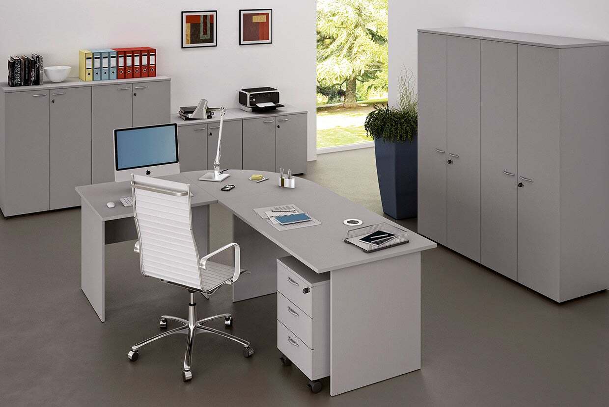 La linea Lione dispone di piano scrivanie in 4 dimensioni, una linea coordinabile con tavolo riunioni, cassettiere, mobili medi basso e alti. Disponibile in 6 diverse finiture con gamba a pannello.