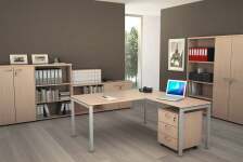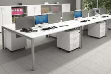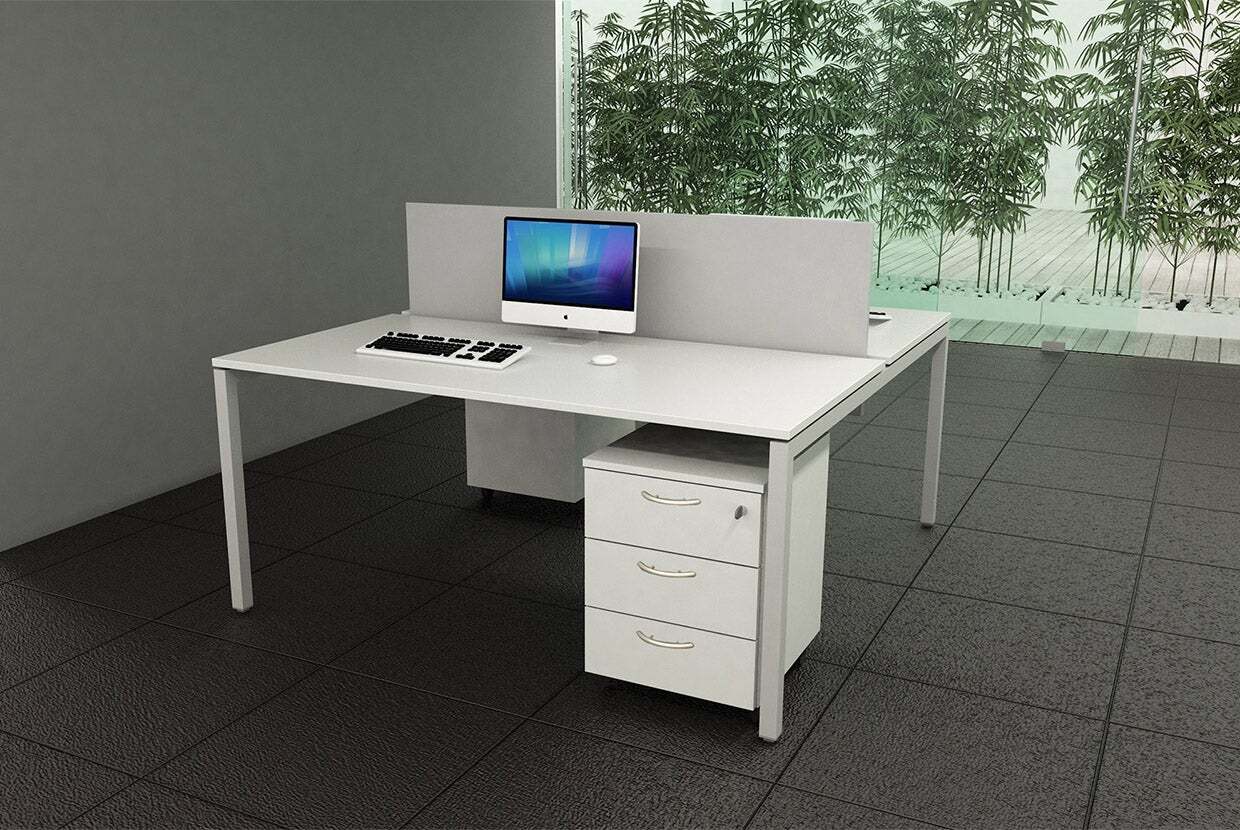 Linea arredo Team Work dal design pulito e minimale ideale per allestire spazi open-space con postazioni di lavoro multiple. Dispone di robuste gambe a ponte in metallo a sezione quadrata con piedini regolabili in altezza. Linea coordinabile con tavolo riunioni, cassettiere, armadi bassi, medi e alti.