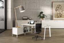 Il design innovativo e dinamico di tipo scandinavo dei mobili Wood-Metal con gambe inclinate in metallo o metallo-legno di forma trapezoidale si fonde con la funzionalità di una linea di arredo solida. Completano la linea cassetiere, armadi medi, bassi e alti, porta cpu, pannelli divisori e mobili di servizio.