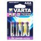 Varta Ultra Lithium AAA Blister 4. Tipo batteria: Batteria monouso, Dimensioni della batteria (o delle batterie): Mini Stilo AAA, Tecnologia batteria: Litio. Altezza: 44,5 mm, Diametro: 1,05 cm, Peso: 7,7 g. Larghezza imballo: 80 mm, Profondità imballo: 12 mm, Altezza imballo: 120 mm. Fattore di forma della batteria: Cilindrico