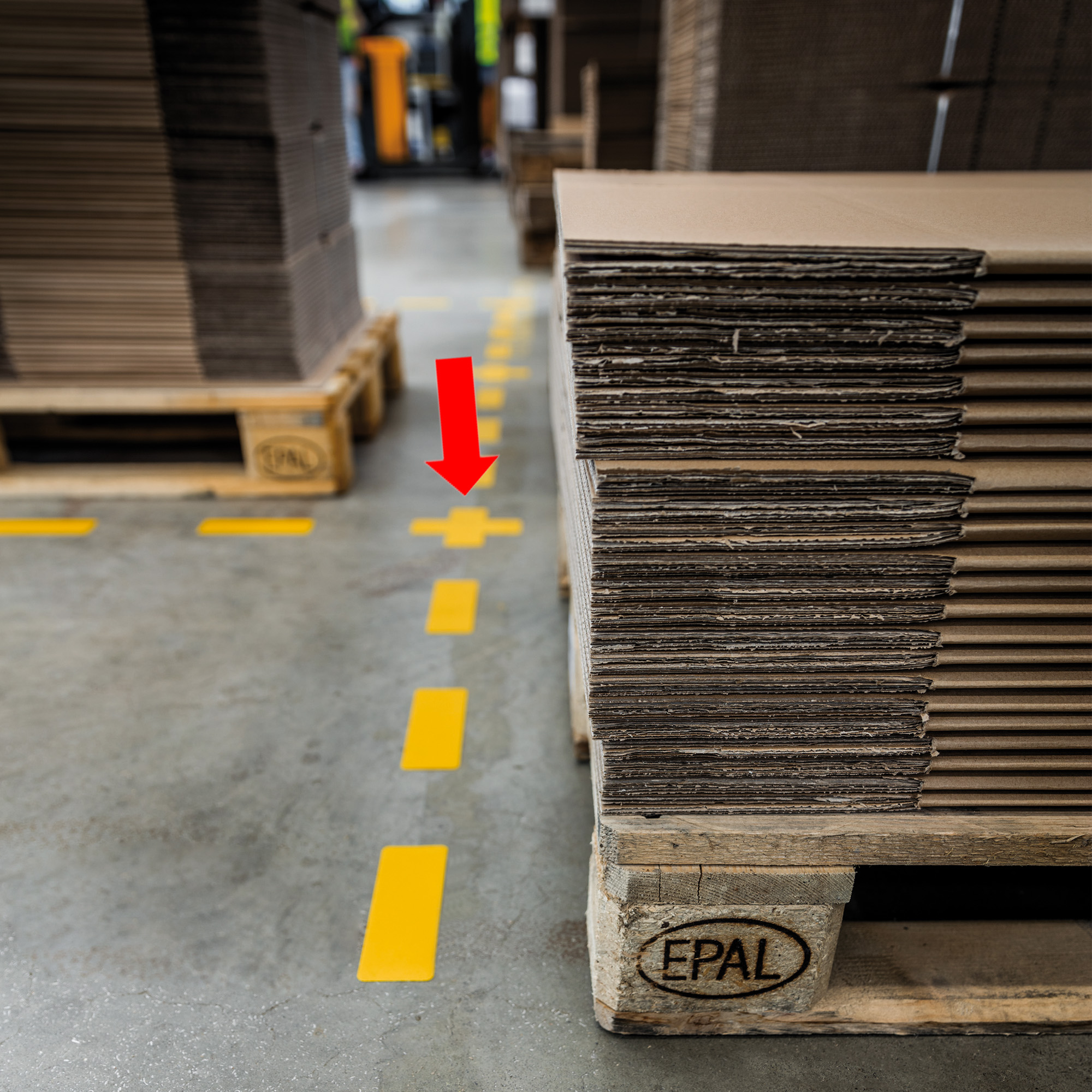 Segnaletica da pavimento sagomata per l'individuazione di aree pericolose, spazi di stoccaggio, passaggi pedonali ecc.