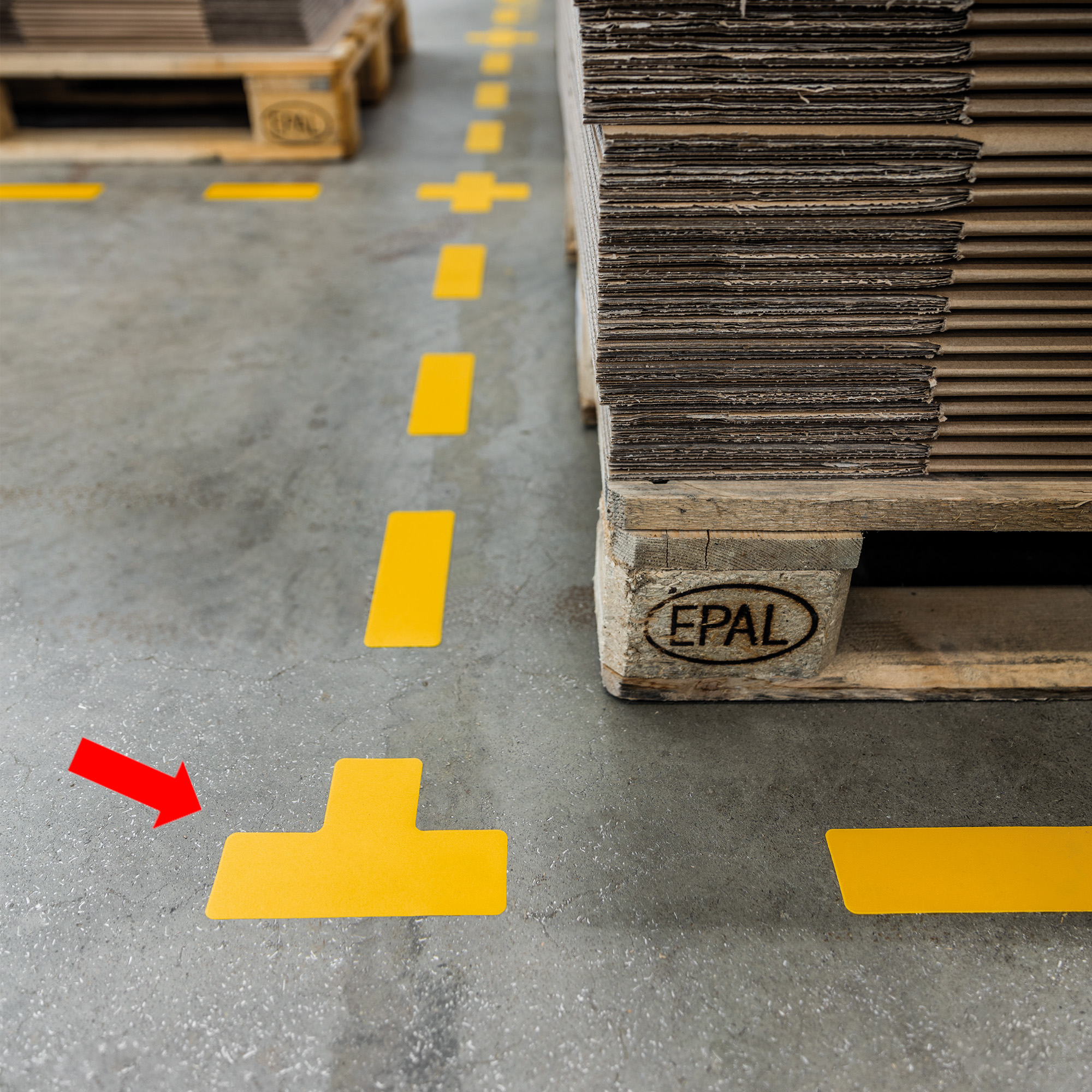 Segnaletica da pavimento sagomata per l'individuazione di aree pericolose, spazi di stoccaggio, passaggi pedonali ecc.