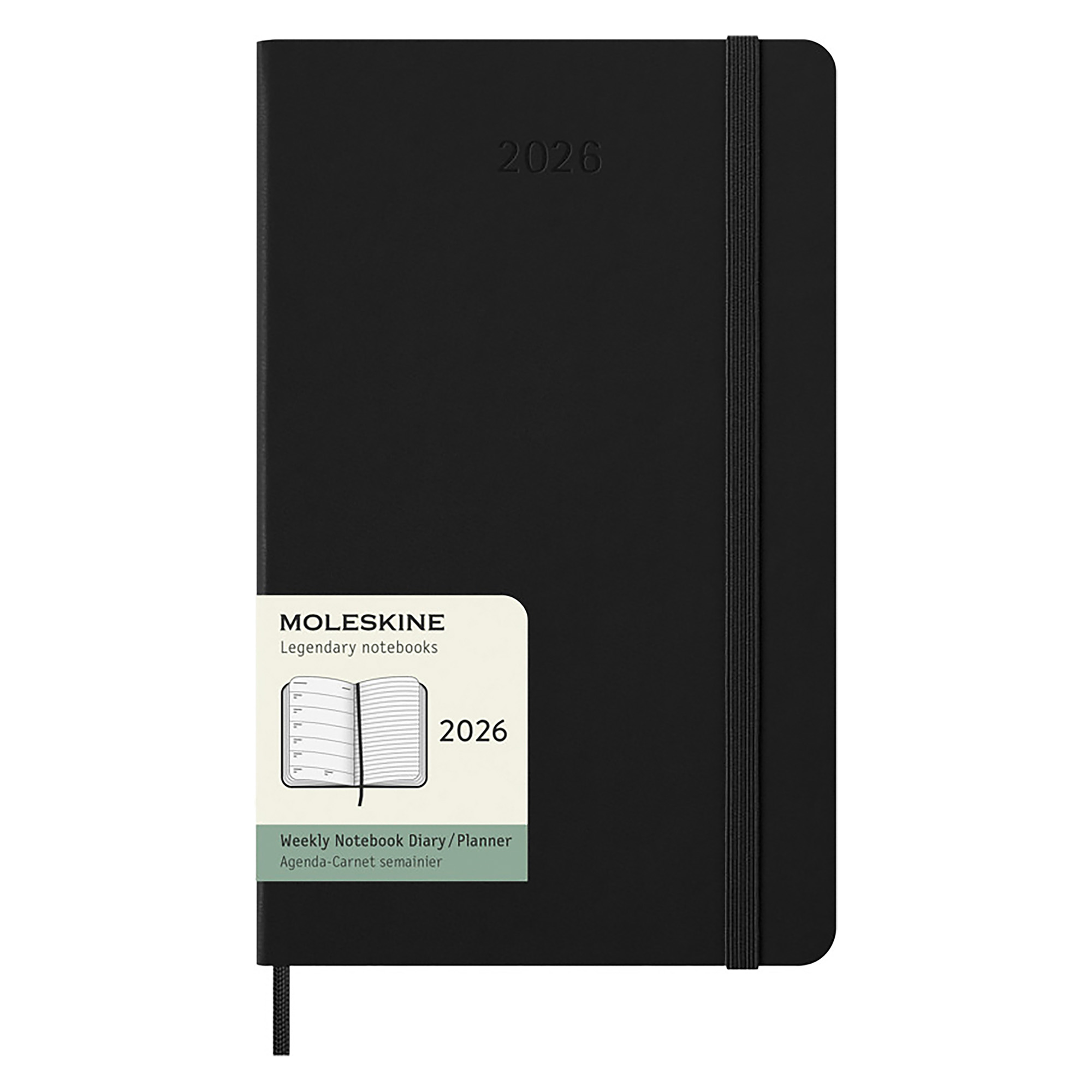 Con durata gennaio-dicembre 2026, l'agenda settimanale 12 mesi Moleskine con copertina rigida mostra l'intera settimana a colpo d'occhio, oltre a pagine